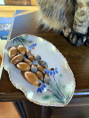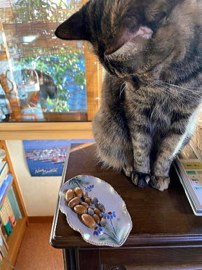 下の写真は、池田が自宅にどんぐりを持ち帰り、飼猫のユキちゃんがジットみているところ。
