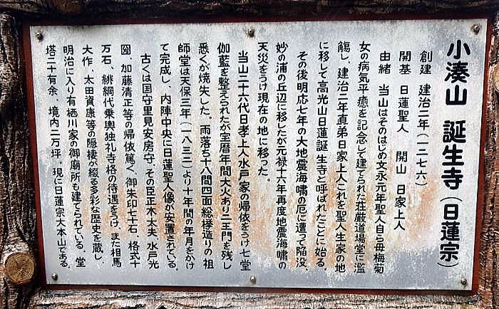 | 千葉視察総合目次 日蓮寺1 日蓮寺2 日蓮四大法難 誕生寺1 誕生寺2 誕生寺3 誕生寺4 誕生寺5 誕生寺6 誕生寺7 ◆誕生寺の概要 下はこの日(12月12日)の行程の確認です。誕生寺は12時過ぎからなので、予定通りです。 ![]() 誕生寺(たんじょうじ)は、千葉県鴨川市小湊にあります、日蓮宗の大本山で、山号は小湊山です。日蓮の誕生を記念して出身地に建立されました。 ![]() 撮影:青山貞一 Nikon Coolpix S9900 2018-12-11 日蓮上人 日蓮聖人は、貞応元年(1222)2月16日、小湊片海の地に降誕しました。その時、庭先から泉が湧き出し産湯に使った「誕生水」、時ならぬ時に浜辺に青蓮華が咲いた「蓮華ケ渕」、海面に大小の鯛の群れが集まった「妙の浦」という不思議な「三奇瑞」が伝えられています。 聖人は幼名を善日麿といい12歳までこの地で暮らしました。文永元年(1264)聖人は母梅菊の病を祈願し蘇生させます。延命した母梅菊はそれを記念し、「菩薩荘厳堂」を創建します。その後、直弟子日家上人が建治2年(1276)10月、聖人生家跡に一宇を建立し高光山日蓮誕生寺と称したのが当山の始まりです。 明応7年(1498)、元禄16年(1703)の2度の大地震、大津波の天災にあい、その後現在の地に移ります。26代日孝上人は水戸家の外護を得て七堂伽藍を再興し、小湊山誕生寺と改称します。しかし、宝暦8年(1758)の大火により仁王門を残し全山を焼失します。49代日闡上人が弘化3年(1846)に現在の祖師堂を再建し、当時関東随一と称されました。 また、国守里見家、正木家より御朱印を賜ります。明治に入り大正天皇御幼少時、病弱の為病気平癒の御祈願を行っています。 昭和から平成にかけて、50万人講を発願し諸堂を復興し、平成4年5月落慶式を行いました。現在、日蓮宗の大本山として全国信徒の参拝の地となっています。 出典:大本山小湊誕生時公式Web ![]() 安藤広重 浮世絵 Source :Wikimedia Commons 歴史 1276年(建治2年)10月、日蓮の弟子の日家が日蓮の生家跡に高光山日蓮誕生寺として建立しました。しかし1498年(明応7年)の明応地震、1703年(元禄16年)の元禄地震と2度の大地震、大津波により現在地に移転されました。 現在、生家跡伝承地は沖合いの海中にあります。 その後、26代日孝が水戸光圀の外護を得て七堂伽藍を再興し、小湊山誕生寺と改称しましたが、1758年(宝暦8年)に、仁王門を残して焼失し、1842年(天保13年)に49代目闡が現存する祖師堂を再建しました。 近代に入り、大正天皇の病気平癒の廟所が建立されました。その後、昭和から平成にかけて、50万人講を発願して諸堂を復興、1992年(平成4年)5月に落慶法要が行われました。 2001年(平成13年)10月には『誕生寺の線香と磯風』がかおり風景100選に選定されています。 江戸時代の不受不施派(悲田宗)禁政のため幕命により天台宗に改宗するところでしたが身延山が日蓮誕生地の由緒で貰いうけ一本山に格下げ(悲田宗張本寺の谷中感応寺、碑文谷法華寺は天台宗に改宗されました。現谷中天王寺、碑文谷円融寺)。昭和21年大本山に復帰しています。 現住は84世石川日命貫首(本山水戸久昌寺より晋山)です。潮師法縁。 誕生寺と火災 以下の解説の出典は、大本山 小湊 誕生寺公式Webです。 誕生寺は様々な災害を被っています。その一つに、火災があります。なかでも元禄16年(1703)の大地震・津波から55年、諸堂も復興し大災害の記憶も薄れてきたであろう宝暦8年(1758)に起きた火災は、七堂伽藍が悉く灰燼に帰し、仁王門などが僅かに焼失を免れたという大きなものでした。 この大火からの復興は並大抵のことではなく、代々の貫首上人をはじめ檀信徒の尽カにより、総門、鐘楼堂、誕生堂、釈迦堂、方丈等を経て、最後に現在の祖師堂が完成したのは弘化3年(1846)のことです。 宝暦の大火を遡る火災については従来知られていませんでしたが、江戸時代はじめの十六世守玄院日領上人の代にも大火があったことが判明しました。千葉県夷隅(いすみ)郡大多喜(おおたき)町平沢の妙厳寺に所蔵される古文書の中に、日領上人の書状一通があり、その中に火災のことが記されていたのです。 日領上人の書状は、仲秋廿冥(8月20日)付で、宛名に「諸山御中参御同宿中」とあり広く関係寺院に宛てられたものです。残念ながら、書状の常で年号は記されていませんが、十五世大妙院日然上人が亡くなった慶長18年(1613)10月以降、元和年間(〜1623)の頃のものではないかと思います。 本文を見ると、「しかれば当寺旧冬炎上の間、一宇営葉の志をもって、去る月より大衆を召集すると雖も、元より謗地の儀、万緒不自由の間、修造もその便を失い候。希(ねがわく)は此の刻、御道徳の余光をもって信者方に勧進せられ、寸紙半銭を嫌わず一粒一穀を掠めず、御奉加資助においては、済々愚僧の大悦、梵閣成満も程あるまじく候」とあり、前年の冬に「当寺」が炎上したことが記されています。 日領上人は署名に「誕生寺日領(花押)」、差し出しに「小湊」と記していましたから、本文中の「当寺」が誕生寺を指していることは明らかで