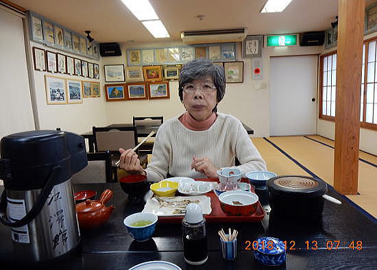 また部屋からは、清澄山や鴨川の町が遠望できます。 ![]() 撮影:青山貞一 Nikon Coolpix S9900 2018-12-12 下は翌日(12月13日)に行く予定の清澄山頂近くの日本山妙法寺の御仏舎利塔の遠望です。 ![]() 撮影:青山貞一 Nikon Coolpix S9900 2018-12-13 下はもともとあった部屋をぶち抜いて作った本館2階の食堂です。 ![]() 出典:www.booking.com 下は出発日(12月12日)、本館2階で朝食をとる池田です。 ![]() 撮影:青山貞一 Nikon Coolpix S9900 2018-12-13 ところで、江澤館で特筆すべきことは、スタンダードの一泊料金の中に、超すばらしい夕食がでることです。残念ながら写真を取り忘れましたが、以下は池田の記憶による料理です。 この季節(12月)は、おつくりのメインにホウボウがでました!! 鯛の兜煮は大きな頭を二つに割ってありましたがたっぷり身がついていて、絶品でした。 1.おつくり(お刺身) ・ホウボウ ・太刀魚(タチウオ) ・鰹(カツオ) ・鰺(アジ) ・イナダ? 2.鯛の兜煮 3.茶碗蒸し 4.煮物(里芋、にんじん、高野豆腐。。。) 5.酢の物(サラダに魚) 6.寄せ鍋(うどんと魚介) 7.サザエの壺焼き 8.焼き魚(甘鯛) 9.ご飯 仁右衛門島1につづく 千葉視察総合目次 |