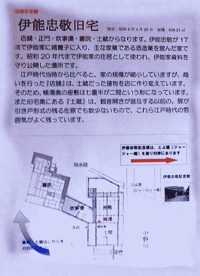 | 千葉視察総合目次 昼食 佐原の歴史的町並1 佐原の歴史的町並2 佐原の歴史的町並3 参考・水郷佐原の風景 伊能忠敬旧宅1 伊能忠敬旧宅2 伊能忠敬の生い立ち ◆伊能忠敬旧宅 伊能忠敬旧宅(いのうただたかきゅうたく)は、千葉県香取市佐原にある伊能忠敬の佐原在住時代の家で、国の史跡に指定されています。 ![]() 撮影:青山貞一 Nikon Coolpix S9900 2018-12-11 以下は千葉県香取市佐原の伊能忠敬旧宅の位置を示す地図です。中央を南北に流れるのは小野川です。 ![]() 出典:グーグルマップ 以下の地図では方位が90度ずれています。 以前は旧宅の敷地内に伊能忠敬記念館がありましたが、現在は旧宅前の小野川をはさんで向かいに建っています。 ![]() 撮影:青山貞一 Nikon Coolpix S9900 2018-12-11 以下は、伊能忠敬旧宅の解説です。 ![]() 撮影:池田こみち Nikon Coolpix S9900 2018-12-11 旧宅概要 伊能忠敬旧宅は、平屋造の瓦葺で、正門・炊事場・書院からなる母屋、店舗、土蔵からなっています。 母屋は玄関、書斎、納戸などの5室、建坪は24坪で、店舖は店および居間などがあって建坪32坪です。 ![]() 撮影:青山貞一 Nikon Coolpix S9900 2018-12-11 ![]() 撮影:青山貞一 Nikon Coolpix S9900 2018-12-11 ![]() 撮影:青山貞一 Nikon Coolpix S9900 2018-12-11 伊能家は佐原の有力な家の一つであり、酒造業や米穀売買業などを営んでいましたが、忠敬は1762年(宝暦12年)に17歳で伊能家に婿養子に入り、1795年(寛政7年)50歳で江戸に出るまでこの旧宅に住んでいました。 店舗・正門は忠敬が来る前に建てられ、書院は忠敬が設計したと伝えられています。 旧宅の南側の奥には観音開きの戸が広まる以前の引き戸形式の戸を持つ土蔵が建っており、かつては忠敬の遺品の多くが納められていました。 また、旧宅の敷地内には旧宅前の樋橋により対岸に水を渡していた水路が残っています。 1930年(昭和5年)4月25日、国の史跡に指定されています。 上記文章の出典は主にWikipeida ![]() 撮影:青山貞一 Nikon Coolpix S9900 2018-12-11 ![]() 撮影:青山貞一 Nikon Coolpix S9900 2018-12-11 ![]() 撮影:池田こみち Nikon Coolpix S9900 2018-12-11 佐原のお土産屋に以下の伊能家の家訓が貼ってありました。 ![]() 撮影:青山貞一 Nikon Coolpix S9900 2018-12-11 ![]() 撮影:青山貞一 Nikon Coolpix S9900 2018-12-11 ![]() 撮影:青山貞一 Nikon Coolpix S9900 2018-12-11 下は忠孝が天体観測に用いた測定器のレプリカです。 ![]() 撮影:青山貞一 Nikon Coolpix S9900 2018-12-11 伊能忠敬旧宅2につづく 千葉視察総合目次 |