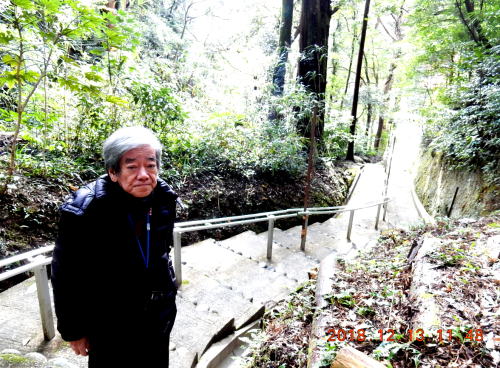 | 千葉視察総合目次 笠森寺1 笠森寺2 笠森寺3 笠森寺4 笠森寺5 参考・天台宗とは 最終日の2018年12月13日午後、千葉県長生郡長南町笠森にある笠森寺を訪問しました。 この笠森寺(かさもりじ)は、千葉県長生郡長南町笠森にある寺院、天台宗別格大本山、坂東三十三箇所の第三十一番札所、山号は大悲山です。 以下は笠森寺(笠森寺)の位置です。おおよそ千葉県のちょうど真ん中、千葉県長生郡長南町にあります。 ![]() 出典:グーグルマップ 周辺にはゴルフ場がたくさんあります。 ![]() 出典:グーグルマップ ![]() 撮影:青山貞一 Nikon Coolpix S9900 2018-12-13 この寺を全国的に有名にしているのは、全国で他にない四方懸造の観音堂があるからです。車を駐車場に置いた後、段数の多い階段(女人坂)を上りつめたところに、笠森寺がありました。 ![]() 笠森寺の灯籠 撮影:青山貞一 Nikon Coolpix S9900 2018-12-13 女人坂部分だけで約128メートル、歩行者専用の階段はおよそ110段ありますが、そのあとも結構長い階段があります。 下はその女人坂の階段の途中で撮影した写真です。 ![]() 撮影:青山貞一 Nikon Coolpix S9900 2018-12-13 ![]() 撮影:池田こみち Nikon Coolpix S9900 2018-12-13 長い階段の途中にはいろいろなものがあります。以下は「女人坂手摺一式」の奉納碑です。 ![]() 撮影:青山貞一 Nikon Coolpix S9900 2018-12-13 以下は「子授楠」です。 ![]() 撮影:青山貞一 Nikon Coolpix S9900 2018-12-13 ![]() 撮影:青山貞一 Nikon Coolpix S9900 2018-12-13 参道にある「子授楠」は、楠の根元の穴をくぐると子宝に恵まれるという御利益があるとのこと。 以下は芭蕉翁の記念碑です。 ![]() 撮影:青山貞一 Nikon Coolpix S9900 2018-12-13 上総最古の芭蕉句碑 元禄時代(1688〜1704)の松尾芭蕉が俳聖としてあがめられるようになると、全国各地に芭蕉句碑が建立されるようになりました。ここ上総国で建立された芭蕉句碑の最古のものが、安永6年(1777)に建立された笠森寺の芭蕉句碑です。 笠森寺の山門手前の崖の上に三基の句碑が並んで建立されています。中央の句碑が芭蕉句碑であり『五月雨に此笠森をさしもぐさ』左右にはそれぞれ各務支考、渡辺雲裏の『片枝に脈や通ひて梅の花』『すへられて尻の落着く瓢かな』の句碑が芭蕉句碑を守るかのように並んでいます。 建立者は笠森村出身の俗名中村義房と称する俳僧故貝であり、故貝の俳諧の師渡辺雲李の17回忌にあたる安永6年に建立されています。句碑建立のいきさつは、故貝の俳書『芭門花伝授』の一節『報恩塚記』や笠森寺境内にある「故貝基碑」によって判明します。 それらによると、故貝は晩年笠森に草庵を結び、天明6年(1726)70歳で没しています。その間、江戸と笠森を何度も往来した寄稿文を残しています。この3句碑は故貝の直接の師雲李の17回忌を期して、芭蕉、支考の3台の師恩に報いるために、江戸の俳諧仲間や故郷の俳諧村連の協力を得て建立されたことがわかります。 女人坂を上ったあとの参道を上り、やっとのことで仁王門に到着も、グロッキー! ![]() 撮影:青山貞一 Nikon Coolpix S9900 2018-12-13 笠森寺2につづく 千葉視察総合目次 |