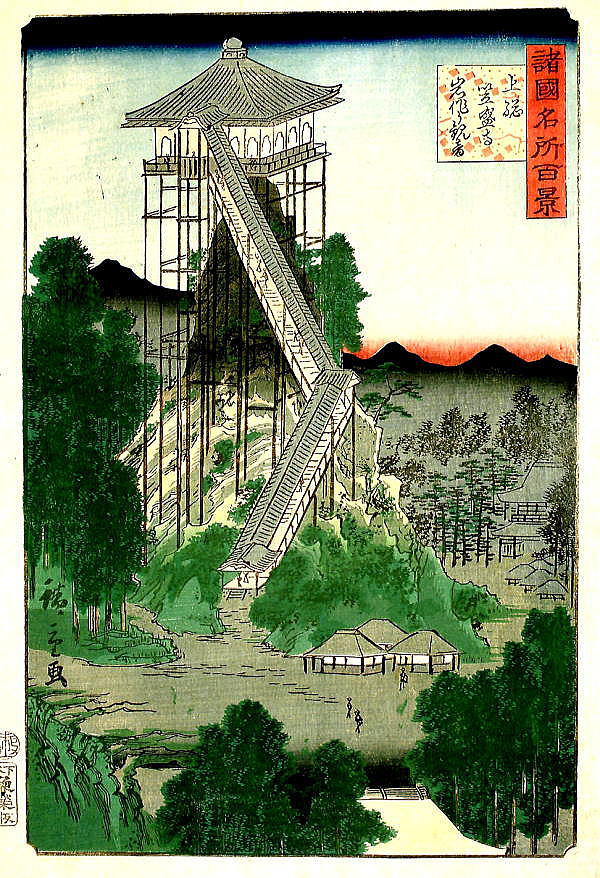 | 千葉視察総合目次 笠森寺1 笠森寺2 笠森寺3 笠森寺4 笠森寺5 参考・天台宗とは ◆大悲山 笠森寺 踊場の内側には、以下の写真にある笠森寺の観音堂のお堂があります。 ![]() 撮影:池田こみち Nikon Coolpix S9900 2018-12-13 以下は観音堂をぐるりと一周した際に撮影した回廊と踊場、お堂の壁です。 ![]() 撮影:池田こみち Nikon Coolpix S9900 2018-12-13 ![]() 撮影:池田こみち Nikon Coolpix S9900 2018-12-13 ![]() 撮影:池田こみち Nikon Coolpix S9900 2018-12-13 ![]() 撮影:池田こみち Nikon Coolpix S9900 2018-12-13 以下は上空から見た観音堂です。 ![]() 出典:笠森観音堂公式Web 以下は、二代目歌川広重の諸国名所百景にみる笠森観音堂です。浮世絵は縦方向に大きくディフォルメされていますが、その分、四方懸造がよく理解できます。 ![]() 出典:二代目歌川広重の諸国名所百景 笠森寺5につづく 千葉視察総合目次 |