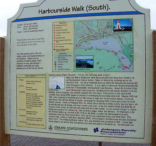 セントジョーンズ湾の周りはハーバーサイド・ウォークというトレッキングトレール(コース)となっている。灯台の位置は地図の下に赤い矢印で示されている。このハーバーサイド・ウォークはセントジョーンズ湾沿いのコースだが、岩場、坂道もありなかなかエキサイティングである。私たちはこのコースの半分を車で周り、車を駐車場に置いて灯台までトレッキングした。