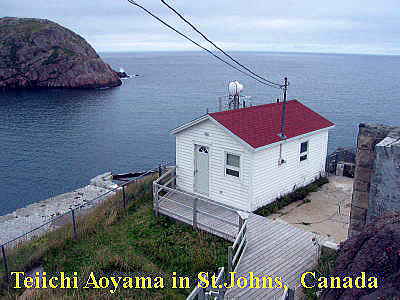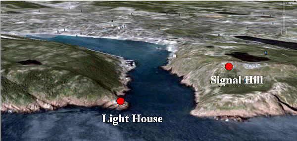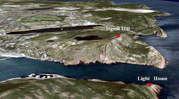 下は灯台の対岸にあるシグナルヒル。頂上に四角く小さく見えるのが通信施設が見える。ここから大西洋を隔ててイギリスと無線通信が行われた。