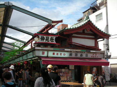 雷門から宝蔵門に至る表参道の両側にはみやげ物、菓子などを売る商店が立ち並び、「仲見世」と呼ばれている。商店は東側に54店、西側に35店を数える。寺院建築風の外観を持つ店舗は、関東大震災による被災後、大正14年(1925年)に鉄筋コンクリート造で再建されたものである。