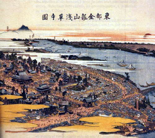 下は、江戸時代の浅草寺(東都金龍山浅草寺)の絵である。文政3年(1820年)である。絵の右側に流れる大きな川は隅田川である。雷門通り、仲見世通りもよく見える。
