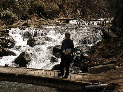 羽根尾を後に、長野原町の吾妻川を下流方面に下る。 途中、やんば館に立ち寄る。昨年の政権交代以来、多くの観光客がここを訪れるようになった。今日も、大型観光バスで来た客でやんば館は混雑していた。 やんば館にて 撮影:青山貞一、Nikon CoolPix S8 2010.7.18 池田さんはやんば館の駐車場に生産農家が出張販売している直販店からとうもろこしを4本購入。ここで買うとうもろこしは、生で食べてもおいしい! やんば館から見た県道橋梁工事 撮影:荒井翔平さん、Canon Digital 一眼 やんば館を後に、八ッ場ダム本体が開発予定だった長野原町と東吾妻町の中間にある鹿飛橋に行く。下の赤い橋が鹿飛橋。橋の下は40mもの絶壁である。 吾妻渓谷の鹿飛橋にて 撮影:荒井翔平さん、Canon Digital 一眼 ここでも昨日の大降雨のせいで渓谷を流れる水量はいつになく多い。 とはいえ、ここは吾妻川の中流、これだけ降ってもこの程度の水位かということでもある。 真夏の吾妻渓谷 撮影:青山貞一、Nikon CoolPix S8 2010.7.18 シャッタースピードを短くして撮影すると、以下のように非常に興味深い水流図となった。 真夏の吾妻渓谷 撮影:荒井翔平さん、Canon Digital 一眼 鹿飛橋で吾妻渓谷の景観美を味わった後、水質測定のため川原湯温泉に向かう。 つづく