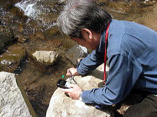 ここからは現地調査の論考である。 ●予備調査(2010年5月5日実施)の概要 2010年5月のGWに行った水質調査の予備調査では、浅間山系の河川の水質は、pH、電気伝導率ともに大きな問題はなかったが、白根山系の白砂川は、いずれもpHの値が低く(酸性が強く)、また水への重金属類やイオンの含有の高さを示す電気伝導率も高かった。 とりわけ草津温泉から流れ出る湯川は、石灰による中和以前は、pHが2.2と強酸性であり、電気伝導率も3.8ms(3800μS/cm)と非常に高かった。ちなみに吾妻川上流の羽根尾地区では、pHは7.9とほぼ中性で電気伝導率も0.17ms(170μS/cm)と低かった。 2010年5月5日の水質(pH)測定結果 出典:東京都市大学環境情報学部青山研究室 2010年5月5日の水質(電気伝導率)測定結果 出典:東京都市大学環境情報学部青山研究室 2010年5月5日の水質(電気伝導率)測定結果(上記のスケールを変えたもの) 出典:東京都市大学環境情報学部青山研究室 ●今回の調査(2010年7月18日実施) 以下は、2010年7月18日に実施した今回の水質調査についての論考だが、随所で2010年5月5日の調査についても触れることとする。 ■神原神社にお参り 7月の3連休のなか日の2010年7月18日(日)、いつものように鎌原神社でお参り。 この鎌原神社は、江戸時代に浅間山が大噴火したとき、この神社に逃げ込んだ村民の命が助かったことで有名だ。真夏ということもあり、鎌原神社の境内は緑が生い茂っていた。 真夏の鎌原神社 撮影:青山貞一、Nikon CoolPix S8 2010.7.18 鎌原神社のお地蔵さん 撮影:青山貞一、Nikon CoolPix S8 2010.7.18 鎌原神社にて 撮影:青山貞一、Nikon CoolPix S8 2010.7.18 2010年5月5日のGWでは、最初に長野原町にある浅間大滝で水質測定を行った。この滝の水は長野原町の吾妻川に流れ込む。