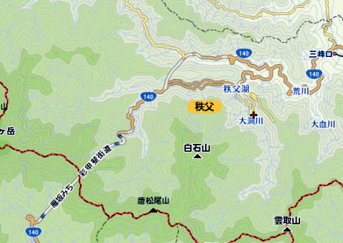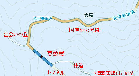 問題の日テレ取材班の事故はこの後に起こった。 脱落ヘリの現場取材を敢行した日テレ社員の記者北優路さん(30)とカメラマン川上順さん(43)は、8月1日、ヘリ墜落現場の滝川下流の2〜3キロ付近で遺体となって発見された。死亡原因は水死とされている。 ![]() 滝川支流の沢で発見された日テレの2社員の遺体 出典:テレビ朝日 ヘリ墜落現場は奥秩父の尾根が互い違いに絡み合いジグザグに曲がりくねった渓谷にであった。現場は国道140号の「出会いの丘」(以下の写真参照)から南へ約3キロ入った奥深い山中でブドウ沢と水晶谷の合流地点である。