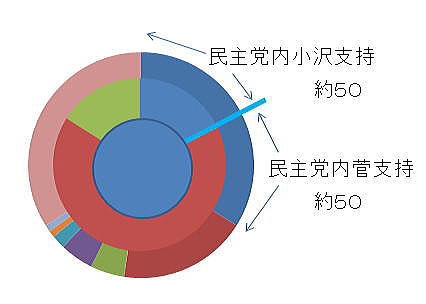 次に結果を円グラフで示す。 下のグラフは民主党代表選の候補者アンケートの結果を示したものである。単位は%である。 菅首相 66% 小沢氏18% 答えない % ![]() また下のグラフは政党支持のグラフである。単位は%である。 1.民主党 35% 6.みんなの党 5 2.自民党 19 7.国民新党 1 3.公明党 5 8.たちあがれ日本 0 11.その他の政党 -- 4.共産党 2 9.新党日本 -- 12.支持政党なし 32 5.社民党 1 10.新党改革 -- 13.答えない 1 ![]() 上のグラフ2つをじーーーと見てほしい。 ちょっと冷静に考えればわかることだが、この世論調査の対象となる国民は、何も民主党支持者だけを相手にしていないのである。民主党以外に自民党、公明党、みんなの党、共産党、社民党、国民新党それに<支持政党なし>も含まれている。 アンケート対象となったサンプルの母集団は、民主党支持者だけでなく、その他の 政党の支持者とともに支持政党なしの人々で構成されているのである。 仮説 ここでわかることは、上の質問1で小沢氏を支持した人の圧倒的大部分は、民主党支持者である。これに対し、菅氏を支持した人は、民主党支持者だけでなく、自民党、公明党、みんなの党、社民党、国民新党それに<支持政党なし>の人も含まれていると推定できる。 だが、代表選挙で直接間接に投票できるひとは民主党に関連する国会議員、地方議員、サポーターなどであって、決して自民党、公明党、みんなの党、共産党、社民党、国民新党それに<支持政党なし>ではないのである。 <代表候補>と<政党支持>のアンケートのサンプルの母集団が同一であるので、読売新聞の世論調査アンケートで民主党に入れた35%ひとのうち、約半分に相当するひとが小沢氏に入れたこととなり、残りの半分が菅氏に入れたことになる。 アンケート結果で表現すれば、母集団を100%とするとその35%が民主党に一票を入れている。また母集団を同じ100%とすると18%が小沢氏に入れていることになり、35−18=17%が菅氏に入れていることになる。 ただし、上記の仮説は、支持政党について自民党、公明党、みんなの党、共産党、社民党、国民新党それに<支持政党なし>に入れたひとが小沢一郎氏に投票していないということにある。 おそらく自民党、共産党、みんなの党支持者で小沢氏に投票したひとはゼロと推察できる。一方、国民新党、社民党支持者の場合は小沢氏に投票する可能性がないことがないが、もともとそれぞれ1%しかないので、大勢に影響はないだろう。 となると、新聞、テレビが連日連夜騒いでいる民主党代表選では、菅首相と小沢前幹事長は、66%:18%ではなく、民主党支持者に限ってみると、まったく互角50:50である。 民主党支持者を100%とした場合 ![]() 当然、自民党、公明党、みんなの党、共産党、社民党、国民新党それに<支持政党なし>は選挙に参加できないので、上記の仮説はまず間違いないと思われる。 上記、すなわち母集団に触れず、菅首相vs小沢幹事長は、66%vs18%と垂れ流す大マスコミは、情報操作による世論誘導をし、錯覚を利用して菅氏に肩入れしていることになる。きわめて犯罪的なことだ。 追記 上記は読売新聞だけでなく、朝日新聞、共同通信など他の新聞、テレビ、通信社でも同様の結果となる!! |