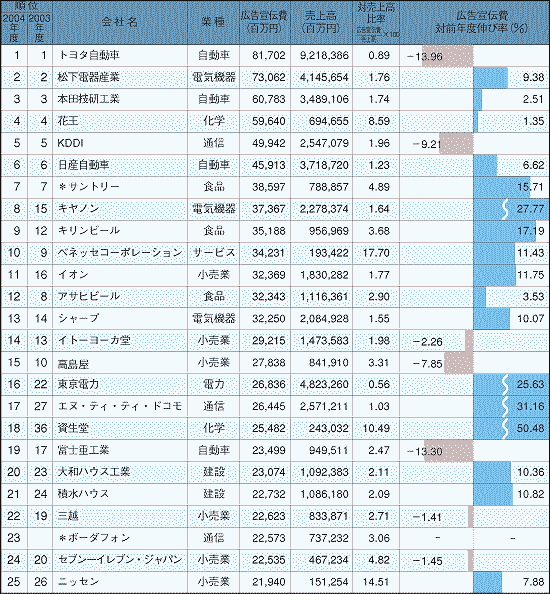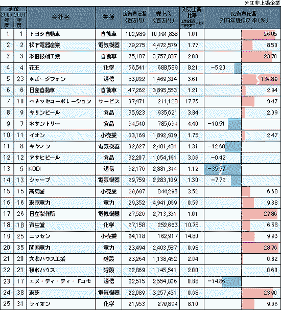 過日、青山ゼミである学生が、今の日本のテレビ局や新聞社などの大メディアが、広告主、スポンサーの意向ばかりに気を遣い、報道機関としての社会的役割を果たしていないかについて、すばらしい研究発表をしてくれた。 私の大学では、卒業研究より一年前に事例研究といって、それまでの単位が70単位以上あると、3学年で研究室に配属され、卒業研究の前哨戦が行えることになっている。私の学部(環境情報学部)では90%以上の学生が3年で研究室に配属となる。 ところで彼(3年生)の研究テーマは、「報道と広告」である。 その学生は、日本の上場など巨大企業の広告費を調べ、ランキング化し、上位20社をリスト化した。さらに、個別具体に自動車のリコール事件をとりあげ、大メディアがスポンサーとの関係でどのようにその事件を扱ったかについて調べた。 すなわち同じようなリコール事故を起こした自動車メーカーに、大マスコミがM自動車については大きく取り上げながら、T自動車についてはリコール数がMよりはるかに大きいのに、あまり記事として取り上げていない実態を調べゼミで報告したのである。 もちろん、この種のこと、すなわち大メディアの収入源である一大広告主に対し、やたら気遣う大メディアの姿勢は、なにも自動車(たとえばトヨタ)に限ったものではない。電力会社(たとえば東京電力)、家電(パナソニック)、タバコ(JT)などの分野で以前から顕著である。 たとえば、スウェーデンの原発事故やイギリスのセラフィールド核燃料再処理工場でのプルトニウム流出などの巨大事故を日本の報道機関がほとんど報道しないことは有名である。 http://eritokyo.jp/independent/today-column-nuclear.htm 以下は筆者が調査した2003年度から2006年度の有力企業の広告宣伝費ランキングである。トヨタ、松下電器産業(現、パナソニック)、本田技研、KDDI、花王、東京電力、キャノンなどが上位の常連であることが分かる。 なお、トヨタ自動車の年間広告宣伝費は、2005年以降、実に1000億円を超えていることが分かる。これらの広告宣伝費は、電通、博報堂などの広告宣伝会社を通じて、テレビ、新聞各社にばらまかれることになる。ちなみに2006年度の上位10社の広告宣伝費の合計は6600億円にも達する。 2006年度の有力企業の広告宣伝費 ![]() 出典:日経広告研究所資料より 2005年度の有力企業の広告宣伝費 ![]() 出典:日経広告手帳より 2004年度の有力企業の広告宣伝費 ![]() 出典:日経広告手帳より 2003年度の有力企業の広告宣伝費 ![]() 出典:日経広告手帳より 次に私が実際に経験した具体例について、広告収入が激減し、ご承知のように赤字を計上しているテレビ朝日を例に示してみたい。 その1 東京湾アクアライン開通時の事例 今から11年前の1997年、川崎から木更津まで東京湾を横断する史上最大の土木系公共事業、東京湾アクアラインなる道路・橋梁・トンネル事業が竣工、開通したときのことである。 テレビ朝日スーパーJチャンネルから、アクアラインの開通により、どんな影響・効果があるのか、について専門的な取材が舞い込んだ。 当時、私が代表を務める研究所が環境庁(現在、環境省)からの委託事業で「東京湾岸地域大気環境の将来予測」などの調査研究をしていたこともあり、私以下の主旨のコメントをした。 すなわち、東京湾アクアラインが開通すると首都圏の骨格が大きくなり、千葉に大気汚染がスプロール(拡大)する可能性が大きいという主旨のコメントを出したのでる。 しかし、夕方の番組をみて仰天、私が結構長くコメントした内容の一部分だけを切り出して、東京湾アクアラインの開通により、東京都の大気汚染が改善するというコメントとなって放映されたのである。私にとってはまさに「情報操作による世論誘導」以外の何物でもない。 そのニュースを見た研究所の同僚だけでなく、何人かの友人がわざわざ電話してきたほどであった。 後日談として分かったのは、史上最大の公共事業費(約1兆4,409億円 )を投入し竣工した東京湾アクアラインの事業主である日本道路公団(当時)への気遣いでコメントがねじ曲げられた可能性を局の知り合いから聞かされた。 当然のこととして、私はテレビ朝日に猛烈に抗議し、テレビ朝日から謝罪も来たが、私のコメントが勝手に編集され、180度ことなった主旨に替えられ大きなショックを受けた。 テレビ、新聞の取材を受けた場合、この種のことは多かれ少なかれ、結構あるのだが、180度発言の主旨が曲げられたのはない。 その2 長野県の事例 2002年、現在参議院議員をしている田中康夫氏が、長野県知事に再選されたときのことである。(ちなみに田中氏が最初に長野県知事に当選したのは2000年) 当時、知人のテレビ朝日の幹部が長野朝日放送(ABN)のC氏が幹部として着任した。 私は研究所の同僚である池田こみちさんが長野県環境審議会の委員に就任したこと、それに別件で県庁に行く用事があったこともあり長野に池田さんと一緒に出向くことになった。 せっかく長