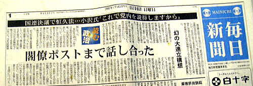 私が小沢代表が辞任の意向を表明することを知ったのは、2007年11月4日(日)午後3時過ぎ、政策学校一新塾の入卒塾式で基調講演を終え、塾生への助言指導をしている最中だった。 独立系メディアの共同代表の池田こみちさんが私の携帯にメールを送ってきた。その場で塾生に小沢代表の辞任意向を知らせたら大きな悲鳴、続いてため息が会場をおおった。 小沢代表の辞任意向の3日前、11月2日、独立系メディアのもうひとりの共同代表、佐藤清文さんが私に読売新聞の社説につき意見を求めてきた。そう「大連立」を読売新聞の社説が呼びかけたことだ。