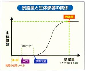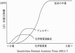 ところで、農作物や加工食品、水などに含まれる金属類や化学物質の中には、ミネラルなど人間が生きて行く上で必須のものもある。だが、金属類の多くは体内に多く摂取した場合、悪影響を及ぼす。必須のものでも、摂取しすぎれば健康を害するのは当然のことである。 特に、重金属類やある種の化学物質については、摂取量によって生体への影響、被害の出方が大きく異なることが知られている。当然、大量に摂取した場合、生体影響が大きく、致死の可能性もある。有機水銀による水俣病、カドミ摂取によるイタイイタイ病などがその一例である。 では、少ない量を摂取した場合どうなのか? 少ない量を体内に摂取した場合の生体への影響は、ひとによって大きく異なる可能性があることが、ここ10数年の米国における大学や研究所などの研究で分かってきた。 たとえば化学物質を多量に摂取すれば、急性中毒となるが、それよりは少ないものの一定量を一度に摂取した場合、あるいは継続的に摂取した場合、ひとによって「化学物質過敏症」という厳しいアレルギー症状を呈する可能性が指摘されている。しかも、一度、化学物質過敏症になると、かなり少ない摂取量でアレルギー症状や化学物質過敏症に固有な症状を呈することになる。 たとえば、動物実験で有害作用が見られないほど暴露量が少ない無毒性量の場合でも、化学物質過敏症や多重化学物質過敏症の人にとって固有の症状がでることが最近の研究から明らかになってきている。 ![]() 図1 従来の暴露量と生体影響の関係 出典:厚生労働省 ![]() 図2 化学物質過敏症を考慮した暴露量と生体影響の関係 以上の関係を図で示すと以下のようになる。図1が従来の暴露量と生体影響の関係、図2が化学物質過敏症を考慮した暴露量と生体影響の関係である。ただし、ADIは一日単位の許容摂取量である。 また東京都杉並区にあるプラスチック廃棄物の中継施設の周辺で起きた「杉並病」はその典型例である。 この場合、非常にやっかいなのは、同じ量を摂取しても「化学物質過敏症」とならない人がいることだ。症状がでない人がいることから、「気のせい」ではないかなどとされ「杉並病」を煩っているひとびとの気持ちを逆なでしている。 |