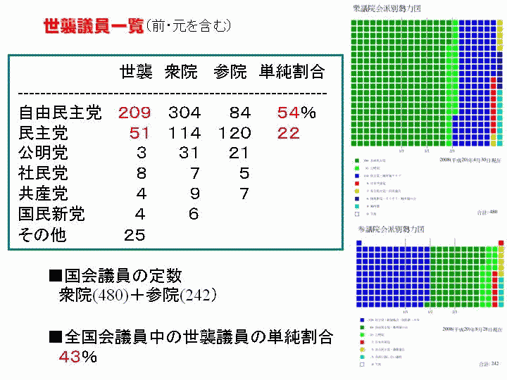 昨日、2008年9月21日(日)、私が代表理事を務める政策学校一新塾において塾生指導、助言に先立ってミニ講義を行った。 「与野党逆転ではじまる民主政治の夜明け(2)」と題するこの演題は、昨年に引き続くものである。このミニ講義は140枚のパワーポイントスライドを使って行ったものだ。 ![]() この度、政策学校一新塾のミニ講義で政党別の衆参議員に含まれる政党別の二世、三世議員の数と割合の概数を算出し紹介した。 ただし、現時点では前職、元職が含まれている。最終的にはそれらを調整した数字を示す予定である。 結果を以下に示す。前職、元職が含まれるとはいうものの、自民党は54%が二世、三世の議員であることが判明した。一方、民主党は22%が二世、三世議員である。 信じられないことだが、全国会議員に含まれる二世、三世の世襲国会議員の単純割合は、実に43%に及ぶことも分かった。 今後、前、元職を除外した正確な割合を情報提供する予定だが、いずれにせよ今の日本では、二世、三世以外が国会議員になるのは至難の業であることが分かる。 地ばん、看板、名声、知名度などをもとに、国会議員としての資質、能力と無関係に二世、三世が国会議員を世襲する日本の姿はきわめて異常であり奇異である。 周知のように総理大臣は、最近だけをとっても小泉→安倍→福田→(麻生)はいずれも二世、三世議員である。安倍、福田はわずか1年で総理、首相を放り出している。こんな先進国は日本以外にない。まさに北朝鮮を嗤えない状況にある。 |