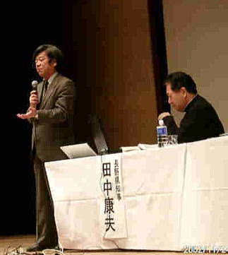下は福島県いわき市で開催したゴミ弁連総会でl講演する青山貞一。隣は田中康夫長野県知事(当時)。