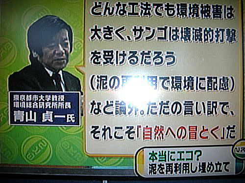 昨日(2010.5.19)夕方、大学の研究室を出ようとしたら、電話が鳴りました。 電話に出えるとTBSの夕方の報道番組、Nスタのディレクターから、普天間基地の代替施設を辺野古に建設する案に関連し、埋め立てに使う土砂に浚渫土砂を使うことで環境に配慮するというトンデモ案を政府が言い出したという。 ついては、一言でその工法へのコメントをもらいたいというのが、依頼だった。 そこで私が出したコメントは以下のフリップにある通りです。 すなわち、どんな工法でも大浦湾のサンゴなど生態系に壊滅的な影響を与えるというもので、そもそも辺野古の海に海兵隊用の基地を建設すること自体、「自然への冒涜」であると話しました。 今年は国連の生物多様性条約国会議が日本(名古屋)で開催される。その年にこともあろうか、世界有数のサンゴの海を時代錯誤の軍事空港建設で埋め立てるというのだから、なにおかいわんやである。 ![]() TBS、沖縄ではRBCニュース Nスタ 2010年5月19日夕方16:53〜 以下は辺野古沖、大浦湾の自然生態系です。この3月三鷹公会堂で公演した後に書いた論考の一部です。これを見ていただければ、大浦湾のサンゴはじめ海洋生物そして海洋生態系がいかにすばらしいものか、また汚染に弱いものであるかが分かるというものです。 ◆青山貞一講演要旨、J鍵を握る環境と安全 -海洋生態系 http://eritokyo.jp/independent/aoyama-col15569.htm |