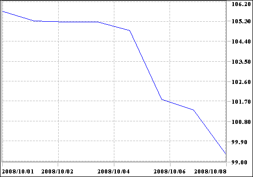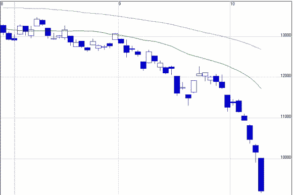 2008年10月8日の東京株式市場では日経平均株価が記録的に暴落した。終値は前日比約953円(9.388%)安の9203円となった。 この値は、2003年6月以来5年4カ月ぶりの安値である。 また下落率としては1987年10月のブラックマンデー(15%安)、さらにたどれば1953年3月のスターリン暴落(10%安)に次ぐ過去3番目のものである。 この東京株式市場の大暴落は、前日の米国における株安を受けたもので、実体経済を主導してきたトヨタ自動車やソニーなど主力の国際優良株を中心に全面安の展開なった。 さらにこの株安は、米国の金融危機に対する米政府の対応が結果的に中途半端であるとの見方が背景にあり、泥沼の様相を呈してきた。その結果、世界的に実体経済への影響を悲観する見方が強まり、売り一本の展開になっている。 このように、世界の株価の悪のスパイラル(連鎖)に歯止めがかからなくなってきた。今後、最悪、市場閉鎖を含め深刻な金融危機から経済危機に突入する可能性も否定できない。 事実、アイスランドはじめ欧州各国では米国の金融危機に端を発して国家破綻寸前の国が出現している。 以下のグラフは、2008年8月以降10月8日までの日経平均株価を1日単位で示したものである。右端が10月8日の株価で前日比953円の大暴落を記録している。 |
