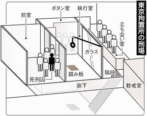 2010年8月27日、法務省は死刑を執行する拘置所内にある死刑場を報道陣に初めて公開した。公開とはいっても、21人の記者のみ、写真やビデオは代表一社のみ、記者から法務省関係者への質問は不可など、きわめて変則的、限定的な公開であった。 日本の死刑場については、過去2度、実際に見たことがあるという元衆議院議員の保坂展人氏が自身のブログで何度も解説しているので、ご覧になった方も多いと思う。 今日、部分公開された死刑場は、一部を除き、ほぼ保坂氏が書かれた図面に近いものであった。しかし、保坂氏も指摘しているように、今回の部分公開では、肝心な絞縄(こうじょう)はなかった。また記者らは執行後、人体が落ちる地下室には入れなかった。 ![]() 出典:中日新聞 2010.8.27 なお、中日新聞の記事によると、今回公開されたのは、(1)所持金品の扱いや遺言の有無を確認、宗教的な話をする「教戒室」、(2)拘置所長が正式に執行を告知する「前室」、(3)死刑囚が立つ踏み板とロープを掛ける滑車がある「執行室」、(4)執行室の踏み板を作動させる3つのボタンが並ぶ「ボタン室」、(5)検察官や拘置所長らが見守る「立ち会い室」である。 ところで、大島渚監督が「絞首刑」という映画を製作していたことをご存じであろうか? この映画(1968年制作)は死刑廃止活動の一環として大島監督が製作したものであるが、そこに出てくる「死刑場」は、東京都葛飾区小菅(こすげ)にある東京刑務所にあった死刑場をモデルにしている。しかし、映画の跡、小菅の東京刑務所は再開発され、下の写真にあるように巨大な高層ビルとなり、それに伴い死刑場も作りかえられている。 ![]() 葛飾区小菅にある東京刑務所 出典:Wikipedia しかし、今日部分公開された現在の死刑場と大島監督が製作した映画の「絞首刑」の「死刑場」は、大部分が近似した空間構成、構造、施設となっている。 以下は、大島監督が製作した映画の「絞首刑」にでてくる「死刑場」の主要部分を示すYouTube動画である。上記のように現在の死刑場は昔のものと異なるものの、その構成、構造は近似したものであり、そこでどのようにして実施の処刑が行われているかが映画を通じてよく分かる。 大島渚監督の映画「絞首刑」の一部 出典:YouTube |