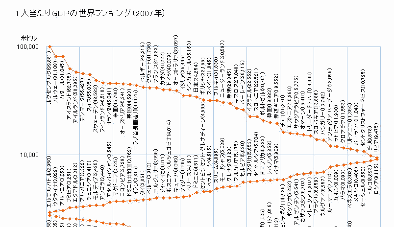 ◆GDP至上主義からの脱却 自民党政権はもとより民主党政権は、ことある度に日本はGDPで米国に次ぎ世界第二位...、中国が....などと、述べてきた。 しかし、GDPの大きさが国民一人一人の生活や幸福度にどう関係するのかについて、政府や学者はまともに調査、研究してこなかった。 そもそもそのGDPも国民一人当たりで見ると、日本は世界で23位であり、GDP至上主義の立場をとった場合でも、ほめられたものではない。 ルクセンブルグ ノルウェー カタール アイスランド アイルランド デンマーク スイス スウェーデン フィンランド オランダ 米国 オーストリア 英国 アラブ首長国連邦 ベルギー クウェート フランス カナダ ドイツ オーストラリア イタリア シンガポール 日本 ギリシア .... |