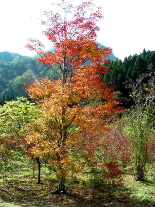 下の写真は背景が全面的に緑のなかでグラデーション的に紅葉となっていた。おもわず車から降りて一枚撮った。