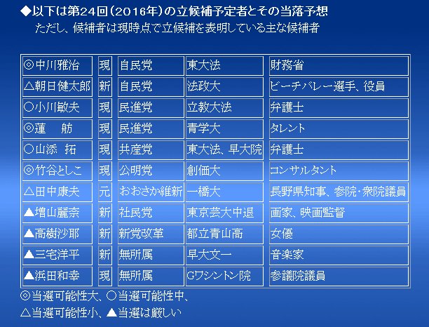 2016年7月の第24回参議院議員選挙、東京選挙区の主な立候補者とその当落予想です。当落予想は、独立系メディア