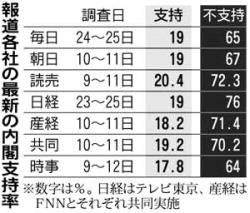 ![]() 出典:毎日新聞 1月中の報道各社の調査結果は上の表の通りだ。読売以外の支持率がすべて10%台となった。その読売新聞では逆に、麻生内閣の不支持率が最高の72.3%と出た。 直近の調査であるフジサンケイ系のFNN調査では内閣支持率が何と、14.4%となった。かつての森内閣同様、醜態をさらしながらの一桁突入も時間の問題と言える。 ところで2009年1月29日の日刊ゲンダイは、一面で次のように述べている。「無責任政党自民党、いよいよご臨終。死に体首相が施政方針演説とは笑わせる。支持率わずか15%にも満たない末期のくせに総理大臣ズラ。国民の批判憎悪は日を追って増えていると書いている」 まさにその通りである。もはやご臨終。死に体内閣である! 衆院選挙を経ずに二世、三世議員が総理をたらいまわしし、跋扈する日本政治を諸外国が相手にするわけがない。地上波のアホメディアは、隣国の後継者をどうのこうの言う前に、日本のお寒い実態を問え。 これほど精神的に貧しい先進国はない。自公はいい加減に国民の審判を仰げ!