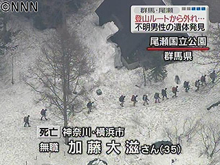 ![]() 尾瀬国立公園で不明の男性、遺体で発見<5/6 17:07> 群馬県の尾瀬国立公園で行方不明になっていた横浜市の無職・加藤大滋さん(35)が6日午前、遺体で見つかった。加藤さんは3日、兄ら3人と尾瀬国立公園の大清水から三平峠を登山中に行方がわからなくなった。警察などが捜索を続けていたが、6日午前9時半ごろ、登山ルートから約500メートル外れた沢で、雪の上に横たわって死亡しているのが見つかった。誤ってルートを外れたとみられている。 動画 |