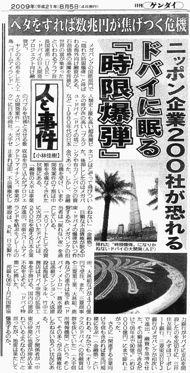 ドバイ・ショックが世界中、とくに日本の金融機関、ゼネコンを席巻しているが、日刊ゲンダイは2009年8月5日号で、以下のように「ドバイに眠る時限爆弾」として、へたすれば数兆円が焦げ付く危機の可能性を明確に指摘していた。 とりわけ「オリックスのドバイへの投資は群を抜いていた」という。それらが不良債権化する可能性についても言及している。昨年のリーマン・ショックは日本の製造業を直撃したが、今年のドバイ・ショックは日本のゼネコン、JBICを含めた銀行、重工、金融機関を直撃することは間違いないようだ! 青山貞一 |