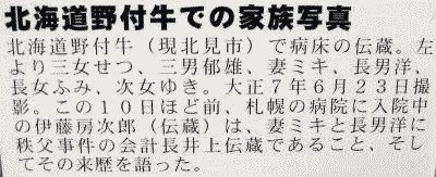 ![]() ●その後の井上伝蔵 1884年(明治17年)11月に起きた秩父事件では会計長を努めた。秩父事件敗北後、逃亡。欠席裁判で死刑の判決を受けたが、北海道に潜行していた。 井上伝蔵は1918年(大正7年)、野付牛町(現北見市)で、秩父から呼びよせた先妻や、変名(伊藤房次郎)のまま結婚した妻と子供に見守られながら波乱に富んだ生涯を閉じた。享年65。なお晩年伝蔵は、子供らに北海道へくる前の事を語ったという。 井上伝蔵の生家は1947年(昭和22年)に取り壊され、いまは空き地となりわずかに「井上伝蔵の家」(吉田町教育委員会)という立看板があるだけである。また墓地も道路を挟んだ畑のなかにある。 秩父時代の妻はコマ(「古ま」とも)。一子フデの子で孫にあたる小林もと(1920年生れ)が、地元秩父市に住んでいる。北海道時代の妻は高浜ミキ。その三女セツの子の佐藤知行(1927年生れ)と田中ゆう子(1925年生れ)が東京都足立区に住んでいる。 2003年6月23日には映画「草の乱」の上映を機会に孫3人が墓参を行っている。 伝蔵は俳句もたしなみ号は柳蛙と号した。「想いだすことみな悲し秋の暮」などが残されている。秩父時代の妻コマは浅草の芸者だった。東京都板橋区の養育院(養老院)で死去している。 事件後、約14000名が処罰され、首謀者とされた田代栄助・加藤織平・新井周三郎・高岸善吉・坂本宗作・菊池貫平・井上伝蔵の7名には死刑判決が下された。