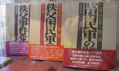 ![]() 北海道に逃れた井上伝蔵の写真 下吉田の龍勢会館にて 撮影:青山貞一 Nikon Digital Camera Cool Pix S8 これについては、映画「草の乱」のあらすじに概要がある。以下参照のこと。 1918年(大正7年)、北海道野付牛町。一人の老人が妻と長男を呼び寄せ、自らの秘密を告白する。老人の本当の名は井上伝蔵、“秩父事件”の首謀者の一人で逮捕を逃れ北海道に渡り、33年のあいだ身分を偽り生きてきたのだった――。1883年(明治16年)秋、秩父郡下吉田村。山間のこの一帯は蚕を育て生糸を売って暮らしていた。しかし、松方デフレや軍備拡張の増税、世界的不況が重なり、人々は借金に頼らざるを得ない状況に陥っていた。生糸商家“丸井”を営む井上伝蔵は、そんな人々の窮状に心を痛め、彼らの助けになりたいと行動に出るのだったが…。 なお本事件に関しては、従来は専ら自由民権思想及び松方デフレの強い影響下に発生したと考えられてきたが、近年はそれらに加えて、前号で詳述したように、他の養蚕地域との比較や、上述の国際的環境の影響、秩父地方特有の民俗学的状況等に関しても考慮した研究の必要性が高まっている。 ※ 秩父事件の年表●困民党軍の組織決起の当日に椋神社で発表された役割表と軍律 役割表(部分)