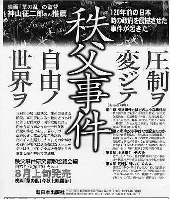 秩父事件を知らない日本人の多くに、その本質を語りかけたのは、神山征二郎監督、緒方直人主演の「草の乱」ではなかろうか。 1918年(大正7年)、北海道野付牛町。一人の老人が妻と長男を呼び寄せ、自らの秘密を告白する。老人の本当の名は井上伝蔵、“秩父事件”の首謀者の一人で逮捕を逃れ北海道に渡り、33年のあいだ身分を偽り生きてきたのだった――。1883年(明治16年)秋、秩父郡下吉田村。山間のこの一帯は蚕を育て生糸を売って暮らしていた。しかし、松方デフレや軍備拡張の増税、世界的不況が重なり、人々は借金に頼らざるを得ない状況に陥っていた。生糸商家“丸井”を営む井上伝蔵は、そんな人々の窮状に心を痛め、彼らの助けになりたいと行動に出るのだったが…。 |