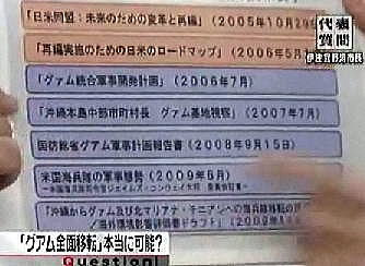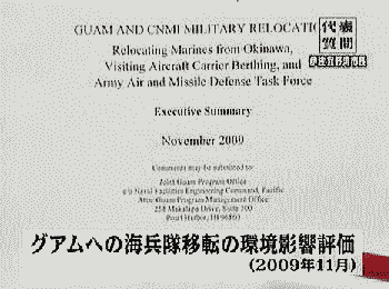 米軍普天間基地を抱える沖縄・宜野湾市の伊波洋一市長が、日テレNEWS24の番組「代表質問」に2009年12月10日出演し、普天間基地移設問題について小西美穂キャスターの質問に答えた。 伊波市長は、米軍側の資料を基に海兵隊のグアム移転計画を分析したうえで、「辺野古移設を普天間返還の前提とする考えはおかしい」などと主張したのである。 ![]() 事実と真実を淡々と「暴露」する伊波宜野湾市長 出典:日テレNEWS24の番組「代表質問」 普天間基地を抱える宜野湾市の伊波市長は、2009年12月、米国の地球規模での軍事再編の一環として沖縄海兵隊のグアム移転について言及した。 グアム移転は「司令部」だけではなく、司令部と沖縄海兵隊の航空部隊が一体的にグアム移転することが2006年7月に米太平洋軍司令部が策定した「グアム統合軍事開発計画」にあるとし、同年9月に米軍の公式Webにはグアム移転では「海兵隊航空部隊と共に最大67機の陸用ヘリパッドの建設」の記述があると「暴露」した。 ![]() 出典:日テレNEWS24の番組「代表質問」 ![]() グアム統合軍事開発計画概要 出典:宜野湾市パワーポイント 話しの中で伊波市長は、米軍の計画は2005年10月までの時点では、グアムに海兵隊の司令部を移転させるだけの計画であった。しかし、その後2006年7月に策定した「グアム軍事開発計画」のなかでは、米軍が移転させるのは司令部だけでなく普天間基地関係を含めた実戦部隊を含めた海兵隊をグアム移転させることにしたと述べている。 現在、約15000人いるとされる海兵隊員のうち、人員レベルの移転規模は沖縄からグアムに移転する海兵隊員は約8000人、家族などが約9000人とされている。 ![]() 出典:日テレNEWS24の番組「代表質問」 だが、日本側はグアム統合軍事開発計画にあるこの事実を知りながら、2006年5月に策定された「再編実施のための日米ロードマップ」をもとに、米軍は司令部だけをグアムに移転し、沖縄に残る米海兵隊が普天間基地代替施設としての辺野古に開発される飛行場を使用するとしている。 これに関連し米国は2006年9月、「グアム統合軍事開発計画」に基づき、沖縄にいる海兵隊のグアム・テニアン移転に伴う一大事業の環境影響報告書作成に着手、昨年11月(2009年11月)にできあがった草稿環境影響報告書を広く告示していることが分かった。 ![]() 米国のNEPAに基づき実施されたグアム統合軍事開発計画 に対する環境影響評価の草稿報告書(2009年11月) 出典:日テレNEWS24の番組「代表質問」 この米国による「草稿環境影響報告書」の作成は、当然のこととして日本の環境影響評価法ではなく、米国の国家環境政策法(NEPA)にもとづき行われている。 米国はこの国家環境政策法(NEPA)に基づく環境影響評価における代替案分析 のなかで、沖縄、ハワイ、グアム、韓国、シンガポール、オーストラリア、タイなど 9カ所の移転先候補地(代替案)の中で、グアムが客観的に一番移転に適すると戦略上から分析、評価しているのである。 ![]() 米軍の草稿環境影響評価書 出典:宜野湾市パワーポイント ![]() 米軍の草稿環境影響評価書 出典:宜野湾市パワーポイント 米軍側のグアム移転計画では、米海兵隊はグアムのアンダーセン基地にある2つの大きな軍事飛行場(その他、民間用がひとつある)を普天間の代替施設として使用することを想定しており、その内容は伊波市長の説明と符合する。 すなわち米海兵隊の沖縄からグアムへの移転計画では、2014年以降に海兵隊関係が大規模で移転するのではなく、当初から普天間飛行場の代替施設ともども移転することになっていたことが上記の環境アセス資料にある人員計画から伺える。 ![]() 沖縄などからグアムへの総人員増加の推定 2010年から2020年までの20年間における グアムへの移転計画(グアム基地の人口増加) 沖縄からグアムに行く海兵隊員の家族住宅建設場所は下図の左の□の地域だが、アンダーセン基地にはすでに二つの巨大な滑走路があり、計画概要図を見ると普天間代替施設としてそれらの飛行場を使う計画も示されている。 ![]() グアムのアンダーセン基地北部地域における飛行施設 (軍事用だけで2つある) ![]() 出典:伊波沖縄県宜野湾市長 日テレNEWS24の番組「代表質問」 ![]() グアムのアンダーセン基地北部地域の移転計画 ![]() グアムのアンダーセン基地南部地域の移転計画 自民党前政権は、おそらく米国のこの戦略、戦術を十分知りながら辺野古への基地建設に係わる利権がらみで普天間の辺野古移転を画策したのだろう。 今後、万が一、名護市の辺野古にV字滑走路を建設しても、その数年後には残りの海兵隊員がグアムに行くことになり、空港は不要となる。 現に民主党の長島外務政務官は、その場合には辺野古を民間利用すればよいとNHKの日曜討論で述べている。信じられないことだが事実である。 大方の自民党議員や長島政務官のような民主の「ネオコン系議員が辺野古への普天間代替施設の移設を急ぐのは、国民が真実を知る前に鳩山政権に辺野古建設を最終合意