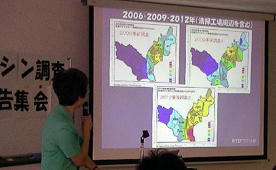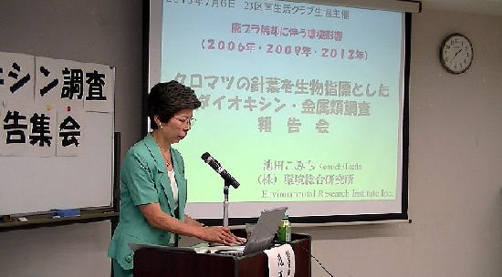 昨日は、東京都世田谷区で生活クラブ主催の松葉を生物指標として大気中のダイオキシン類及び水銀など重金属類を市民参加で測定関する活動の調査報告会がありました。報告は1999年の調査開始以来この活動の事務局長をつとめている環境総合研究所顧問の池田こみちです。 世田谷区三軒茶屋の会場は生活クラブ東京23区の組合員、一般参加者、23区行政関係者らで超満員となりました。 広島県や山形県からも参加されました。今回、青山貞一と鷹取敦が2台の超小型ハイビジョンカメラを会場に持ち込み、池田の調査報告、その後の質疑応答のすべて収録しました。これについては後日、独立系メディア E-wavet Tokyoで公表する予定です。 ![]() 撮影:青山貞一 Victor GZ-265E 2013-6-6 本生活クラブの松葉調査の大きな目的は、東京都が廃プラスチックを焼却処理する前後に松葉を生物指標として大気中のダイオキシン類や重金属類の年平均濃 度を測定することによって、汚染レベルがどう変化したを定量的に分析、評価することにあります。対象は東京23区南部地区(世田谷区、大田区、品川区、目黒区、江東区、江戸川区)を対象に評価することにあります。 調査結果の詳細は動画にゆずりますが、結果を要約すれば、東京23区南部地域の大気中のダイオキシン類濃度及び12種類の及び重金属類濃度の多くが廃プラスチック焼却後大幅に濃度が上昇しています。 ここ数年、東京都ががれき広域処理で大量の震災廃棄物を焼却していますが、その影響を定量的に把握することは困難ですが、廃プラ焼却の影響はほぼ間違い のないところです。とりわけ東京都大田区、江東区などでの濃度の上昇が顕著となっていました。 ここ3年、3.11による福島原発事故の影響が重要なものとなっていますが、その影で間違いなく大気中のダイオキシン類(PCDD, PCDF, Co-PCB)そして水銀はじめ各種の重金属類濃度が上昇していたことが定量的また異性体、同族体などのパターンとして把握されたことになります。 ![]() 撮影:青山貞一 Victor GZ-265E 2013-6-6 ご承知のように空気は水のように選択して摂取することはできず、毎日一年365日吸い続けるものであり、濃度上昇はそのまま私達の健康リスクを高めることになりかねません。 環境総合研究所(東京都目黒区)では、1999年以降、カナダ・オンタリオ州トロント郊外にありますカナダ最大の分析機関と技術、業務提携を締結し、全国規模で行われている日本の松葉を用いた大気中ダイオキシン類の測定監視活動を測定分析、技術面で全面サポートしてきました。 この間、全国で一連の松葉調査で参加された市民の数は10万人を超えています。また分析結果は、国際会議、国内外の学会にも多数発表しています。 なお、池田が作成し昨日会場で配布しましたカラー版の詳細調査報告書は、A4で40頁弱に及ぶもので、学術的にもオリジナリティーがあるものです。 池田こみちから別途、正式な報告がありますが、この間、松葉の採取、費用のカンパなどにご尽力されました23区南生活クラブ生活協同組合の皆様には、この場をお借りして感謝申し上げます。 |