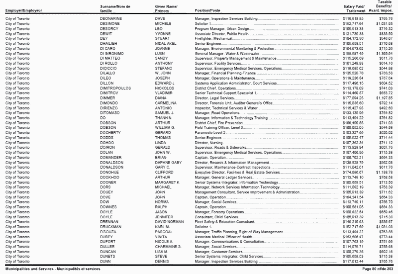 以下は市町村職員(トロント市)の給与公開の一例。左から@市町村名、A氏、B名、C職制、D年収給与、E支払い税額