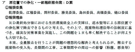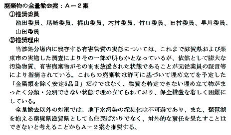 嘉田由紀子滋賀県知事は、着任後、滋賀県における永年の課題である栗東市の産廃処分場問題を解決するため、RD産廃処分場対策委員会を立ち上げた。 以下は委員会の委員名簿である。任期は平成18年12月から平成20年3月まで、その間、都合15回の委員会が開催された。 ![]() 出典:滋賀県 実は、この委員会の設置に関連し、私は嘉田知事から相談を受けた。 嘉田知事は、当選間もない頃、東京都港区にある赤坂プリンスで当選に至るさまざまな裏話しをされたが、同時に栗東産廃処分場問題の解決に向け委員を推薦して欲しい旨の協力を依頼した。 周知のように、産廃問題は法制度、技術の知識とともに、現場を数多くこなし、実務に通じている者でないと、委員として役にたたない。結果的に役人の思うつぼになってしまう。 そこで、私は梶山正三弁護士と池田こみち環境総合研究所副所長を委員として嘉田知事に推薦した。 ◆はじめから頓挫、役所主導の委員会 最終的に15回開催された委員会だが、入り口から役人との闘いとなった。 どの自治体の委員会でも委員長を誰するかが問題となる。というのも、役所側があらかじめ根回しし、ある委員を委員長とするように仕掛けるからだ。 案の定、役所側はデキレースを仕掛けてきた。 しかし、早川滋賀大学教授が自ら委員長に立候補したことで、委員長に就任予定の大学教授とそれを仕掛けた役所側は狼狽する。デキレースがうまくゆかなかったからだ。 15回の委員会はことのはじめからこのように荒れ模様となった。というより、日本の行政関連委員会の常、すなわち役所のシナリオで委員が誘導される方式はこの委員会ではまったく通用しなかった。 産廃問題がデッドロックに乗り上げる理由には、廃棄物処理法のデキが悪い致命的な問題があるものの、現実には県の廃棄物部署が本来するべきことをしない、していないことが大きな理由である。 いくら住民が役所に苦情、文句を言っても役所はまともに動かない、形だけの勧告を出すものの、産廃業者はそんな勧告などへのカッパであることが圧倒的である。法にある立ち入り検査も、デキレース、つまりあらかじめ役所が業者に連絡を入れることで業者側にとっては怖くない。業者と役所がツーカーとなっていることも多い。 そもそも私が特別地方公務員でいた長野県の場合、廃棄物行政のトップである生活部長が退職すると、そのまま長野県の産廃業界でつくる協会の事務局長に就任していた。関連課長の多くも産廃業界に天下っていた。 推定するに、栗東の産廃問題の最大の原因も、業者以外の原因の大部分は県の廃棄物行政、環境行政自身にあると思える。 ◆結論をねじ曲げた知事の取り巻き 委員会は当然のこととして紆余曲折する。 人選段階から役所側の強い意向が働いていた委員会であったが、委員会の議論でもこれは強い影を落とした。 その理由の多くは、滋賀県の廃棄物関連部署と役人だと思える。彼らは知事にあれこれ情報操作による誘導を行ってきた。問題は、それら役人からの情報や誘導策動を遮断し、知事自ら産廃問題解決を判断するという強い決意、意思が委員や県民に伝わらなかったことだ。 委員会議論の核心は、永年、安定型最終処分場に不法投棄されてきた汚染まみれのゴミをどうするかにあった。その中心は有害物質を含む汚染された廃棄物の実態をどう把握するかにあった。 そうこうしているうちに、委員会としてのひとつの解決案が出されるに至った。 解決案は、複数の案として出された。多くの委員(8人)の賛同を得たのは、A−2案であった。だが、最終案が出そろう時点では、すでに嘉田知事は完全に滋賀県の役人達に取り囲まれていたと言える。 知事はA−2案ではなく、D案を採用する。もう少し詳しく経過を述べれば以下の通りとなる。 委員会では、RD最終処分場問題を解決するための具体的対策として、7つの対策工案について議論を重ね、平成20年4月、対策委員会として案が嘉田知事に答申された。 対策委員会の推奨意見として出されたA−2案は、8人の委員が賛成した廃棄物を「全量撤去する」という案であり、最も費用がかかるA案をもとに費用の削減案を含め提案されたものだった。 その他、7人の委員が賛成する「水を遮る壁をつくり、土で覆って有害物を掘削除去する」D案なども併記された。 以下は、8人の委員が賛同したA2案。 ![]() 出典:滋賀県 以下は、7人の委員が賛同したD案。 ![]() ![]() 出典:滋賀県 ![]() 滋賀県RD最終処分場問題対策委員会の開催風景。 出典:滋賀県 その他、E案などもあったが、上記の2案が全体の大勢を占めた。 永年被害を受けてきた最終処分場周辺の住民は、当然のこととして地元から選出された委員が入り賛成した「全量撤去する」(通称Aー2)案を嘉田知事が採択するものと思われた。 だが、嘉田知事は、なぜか対策委員会で推奨案として出された全量撤去のAー2案を廃棄物を運搬する車両の騒音や排気ガス、廃棄物を掘り起こす際の悪臭と
