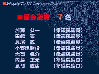 ●特集:政策学校一新塾15周年記念講演会 2009.10.4 ◆政策学校一新塾15周年記念講演会(1) ◆政策学校一新塾15周年記念講演会(2)一新塾の15年間 ◆一新塾記念講演-主体的市民による日本変革のシナリオ@ ◆一新塾記念講演-主体的市民による日本変革のシナリオA ◆一新塾記念講演-主体的市民による日本変革のシナリオB ◆一新塾記念講演-主体的市民による日本変革のシナリオC その1に戻る 以下は青山貞一の記念講演のあらましを当日使ったパワーポイント(183枚)のなかから主なものを紹介する。 ![]() ![]() ![]() ![]() ![]() ![]() ![]() ![]() ![]() ![]() ![]() ![]() ![]() ![]() ![]() その3につづく |