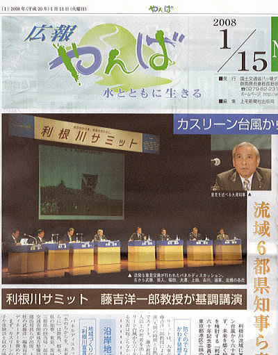 ●地元新聞が八ツ場ダムの広報紙を編集する異常! まともな情報公開や説明責任を果たすこともなく、八ツ場ダム建設工事は今日も粛々、淡々と進んでいる! ところで、予算額でダントツの巨大ダム事業が首都圏の一角である群馬県で進行しているにもかかわらず、新聞、テレビなどマスメディアは国土交通省に遠慮してかどうか、その実態をほとんど報道していない。 あれほど筆者が問題を指摘しておいたのに、まだ上毛新聞社が仕事を得ている。次は友人の議員らに国会質問をしてみたい! ここ数ヶ月、国会、メディアは暫定税率問題そして道路特定財源の一般財源化など、高速道路問題で大騒ぎしてきた。しかし、首都圏で展開するこの巨大なダム事業の実態や、ダム建設がもたらす問題点をマスメディアは取材もせず、報道もしていない。 そのこと自体、中国や北朝鮮ならいざ知らず、民主義国家にあるマスメディアとしてきわめて異常なことと思える。 昨年夏、「独立系メディア」の以下の論考(ブログ)で指摘したように、本来、八ツ場ダム建設がもたらす環境や財政の破壊を現場で取材し、地元だけでなく広く納税者、国民に周知すべき立場にある地元新聞である上毛新聞は、国土交通省から八ツ場ダム関連の広報紙編集とその各戸配付業務をこともあろうか特命随意契約で受注していた。 ◆青山貞一:日本のメディアの本質を考えるJ巨大公共事業推進の先兵 今回の現地視察でも、私たちは国土交通省現地事務所が設置している広報センター「やんば館」に行き、豪華なカラーパンフ、「広報やんば」をもらったが、このパンフこそ、まさに上毛新聞社が編集と各戸配付を担当しているものだ。 上述のように上毛新聞が本来すべきことは、予算規模において日本最大の環境破壊ダムを現場でつぶさに監視し、連日紙面で警告することにあるはずであるが、そのメディアが国土交通省から編集、配付の仕事を受け、国土交通省の広報活動の一端を担っていること自体、きわめて異常なことと思える。 上毛新聞社は国土交通省の現場事務所からいくばくかの仕事を得ることで、メディアとしてもつべきジャーナリスト精神を捨て去り、事業者の手先と化している、と思われても仕方ないだろう。 何度も指摘するが、日本のマスメディアの基本姿勢は本質的、根本的なところで間違っている。本来、国家権力や行政行為を国民、納税者の側に立って監視、批判すべきマスメディアが、こともあろうか特命随意契約で国から業務を受注し、国の広報組織に成り下がっている。その実態はマスコミ機能の死滅を意味する。 ●事業者と御用メディアによる「自画自賛」の利根川サミット ところで、「広報やんば」は、その一面で「利根川サミット」を特集していた。 「利根川サミット」は、カスリーン台風来襲60周年を記念して水害対策などを改めて検討することを主旨として2007年11月に開催されている。 主催はカスリーン台風60周年記念委員会、東京都港区の三田にある笹川記念会館で行われている。 「広報やんば」をよく見れば、このシンポジウムは、八ツ場ダムの建設当事者である国土交通省と群馬県、栃木県、茨城県、千葉県、埼玉県、東京都など、なぜかダムの建設費を国に上納している関東の関連都県の幹部だけで開催されている。 そして、かの上毛新聞社の編集局長が、「利根川サミット」の司会をしているのである。 下のカラーパンフにある出席者(=発言者)は、大澤群馬県知事、福田栃木県知事、上田埼玉県知事、坂入茨城県企業局長、古川千葉県土整備部長、道家東京都建設局長、国土交通省は関東地方整備局局長、それに司会をする上毛新聞社の編集局長である。 ![]() 出典:国土交通省 広報 やんば 2008年1月15日号 利根川サミットには、以下のWebにあるように、誰でも参加申し込みができることになっているものの、パネリストは税金を使い事業を進める国、自治体などの事業者だけであり、この事業がもたらす財政、環境への影響などに危惧を抱くひとはまったくいないのである。今更ながらこれには驚いた! https://www.ktr.mlit.go.jp/kyoku/river/tonegawa_info/input.htm 国土交通省から広報事業の仕事を特命随意契約で受けている地元新聞社、メディアである上毛新聞社の編集局長が司会を行い、シンポジウムの結果を広報紙で特集し掲載する。これはまさに「自作自演」そのものではないか。 さらに特集を読み進むと、パネルディスカッションは、カスリーン台風来襲との関連でダムの必要性を強調するものばかり、まさに事業者による八ツ場ダム事業の「自画自賛」である。 「やんば館」でも、DVDや掲示ポスターでカスリーン台風被害がことさら強調されているが、「利根川サミット」でもカスリーン台風被害がことさら強調されているのである。 パネル討議のなかで、大澤群馬県知事は昨年(2007年)9月に首都圏を襲った台風9号について、「土砂災害で大打撃を受けた。備えを怠ってはならないと実感」と述べている。だが