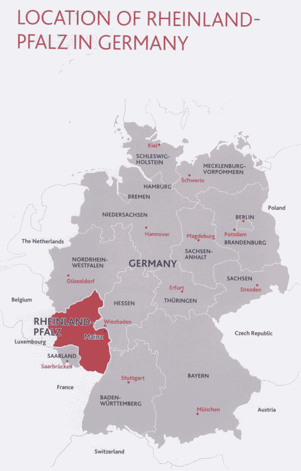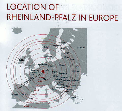 ◆ラインランド・プファルツ州の位置 さて、ドイツ・ラインラント=プファルツ州(ドイツ語:Rheinland=Pfalz)の位置だが、上の図で分かるように、まさにヨーロッパの中央にある。またラインラント=プファルツ州は下のドイツ全図にあるようにドイツの南西、ベルギーやルクセンブルグに近い位置にある。州都はマインツである。比較的近くにはフランクフルトや有名なフライブルグなど日本人になじみの深い都市もある。 ![]() ヨーロッパの中央に位置するドイツ・ラインラント=プファルツ州 Source:Rheinland=Pfalz at a Glance, Facts and Figures ![]() 連邦国家ドイツには16の州がある Source:Rheinland=Pfalz at a Glance, Facts and Figures 周知のように連邦国家であるドイツには16の州がある。そのうちラインラント=プファルツ州は人口規模で7番目、約400万人が居住しており州都はマインツである。6番目にはザクセン州、8番目にはベルリン(特別政令市)がある。