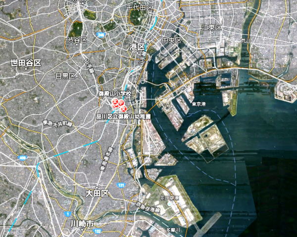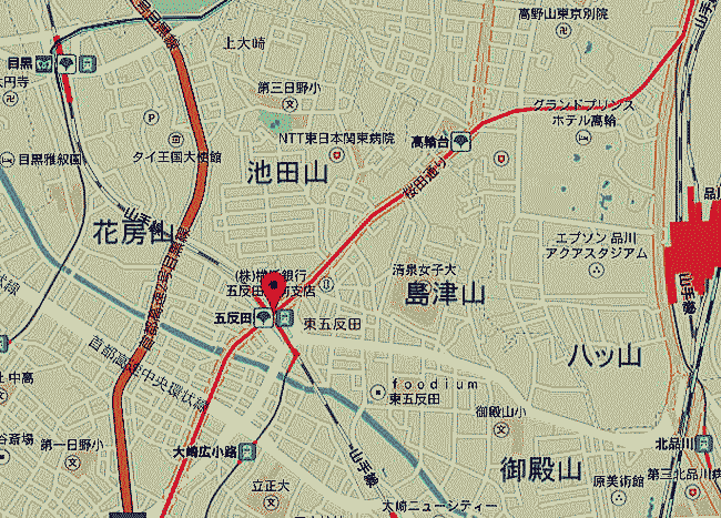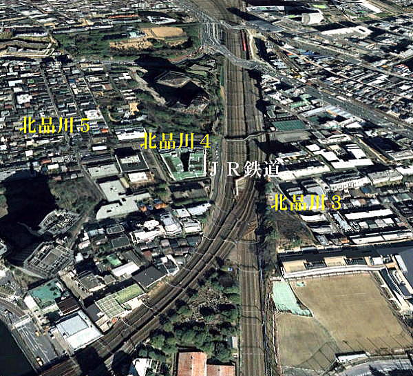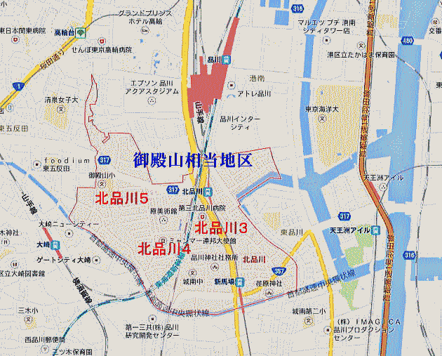 ◆御殿山(ごてんやま) 城南5山の最初は御殿山です。 御殿山は「目黒川とサクラ」で最後に行った大崎新副都心のすぐ北側からJR山手線の海側の北品川一帯、現在の地番では品川区北品川3丁目、4丁目と5丁目に相当します。 なお、御殿山地区へはJR品川駅、JR大崎駅以外に京急の北品川駅が最も近い駅となっています。 ![]() 東京都における御殿山の位置 出典:グーグルマップ ◆江戸時代の御殿山の位置 下は歌川広重(初代)の東都名所 御殿山花見 品川全図の一部です。多くの絵から構成されており、見づらいのですが、江戸時代の御殿山と北品川宿の位置関係が明確に示されている貴重な資料と言えます。 下図では右側にサクラ花見の御殿山が描かれ、中央に東海道の北品川宿が見えます。さらに上側には沢山の船が停泊する東京湾が描かれています。 ![]() 東都名所 御殿山花見 品川全図の一部 歌川広重(初代) 出典:江戸時代の道、第11回、品川区 以下は、楊斎延一、東京名所「御殿山より品川を望む」、明治32年(1899)です。出典は品川区インターネット美術館です。 この東京名所「御殿山より品川を望む」(明治32年)と上の東都名所「御殿山花見」の絵(江戸時代)はほぼ似た位置、すなわち御殿山から東京湾を望んだものと推察できます。 ![]() 楊斎延一、東京名所「御殿山より品川を望む」、明治32年(1899) 出典:品川区インターネット美術館 ◆江戸時代の御殿山の現在の位置 上の貴重な2つの絵から推察すると、JR山手線の海側にあたる北品川3丁目は江戸時代は御殿山の主要部分を構成していましたが、明治維新以降、とくにJR山手線やその後の京急電鉄の開通により御殿山を地形改変することで山(丘)は大幅に削られています。 すなわち以下の地図で北品川3丁目と4丁目、5丁目は丘陵、高台として一体のものでしたが、明治以降のJRや京急などの鉄道の軌道を立地する際に、3丁目と4丁目の間の丘陵が削られ、現在の谷とに地形が改変されています。 ![]() 江戸時代の御殿山相当地区 出典:グーグルマップ その結果、現在における「御殿山」は、ミャンマー大使館、セルビア大使館、モーリタニア大使館などの大使館や原美術館など閑静な住宅地、さらに森ビルが開発した御殿山ヒルズ(現在はトラストタワーという高級マンションとマリオットホテル、品川教会、御殿山庭園)などとして再開発されている北品川4丁目さらに「ソニー村」と言われた北品川5丁目地域、さらに上述のJR山手線の海側に当たる北品川3丁目の「権現山公園」あたりが相当するものと推察されます。 ![]() 江戸時代と現在の「御殿山」の地形断面の変化 ただし、縦軸はディフォルメしていいます。 出典:青山貞一 下の衛星写真は現在の御殿山周辺を示しています。鉄道の軌道が東西に御殿山を分断していることがよく分かります。<北品川3>の北に相当する部分に「権現山公園」があります。権現は言うまでも無く徳川家康を示します。江戸時代、この辺は「品川御殿」ともよばれていました。 ![]() 江戸時代の御殿山相当地区 出典:グーグルアース 下の写真は「権現山公園」に行くための階段です。当然のことながら、この権現山公園は桜の名所となっています。 ![]() 北品川3丁目の権現山公園に行くための階段 出典:グーグルストリートビュー ![]() 出典:サクラハウジング