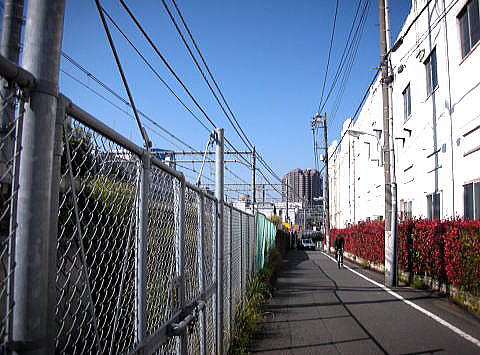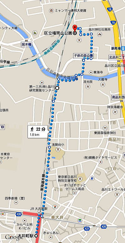 ◆大井町駅から「権現山公園」へ 下の地図は、大井町から品川区立「権現山公園」まで歩いた経路を太い点線で示しています。大井町から東海道線(東海道新幹線)の線路に平行に走る道路を北上し、途中で一旦目黒川沿いに東側(右側)に歩き、その後、再度、北上して御殿山公園まで歩きました。時間はおおよそ20分です。 ![]() 出典:グーグルマップ 実際に大井町から東海道線沿いに歩いてみると、線路際にも沢山のサクラの木があり、満開状態となっていました。下の写真はその一部です。 ![]() 大井町近くの東海道線沿いのサクラ 撮影:青山貞一 Nikon Coolpix S8 2015-4-2 写真には東海道線そして東海道新幹線の線路が見えます。 ![]() 撮影:青山貞一 Nikon Coolpix S8 2015-4-2 このあたりのサクラはなかなか立派です。しかも、フェンス沿いに数100m続きます。 ![]() 撮影:青山貞一 Nikon Coolpix S8 2015-4-2 この後、日本ペイントの工場辺りで下の写真のようにサクラ並木はなくなりフェンスだけとなります。フェンスの左側は東海道線、東海道新幹線の線路となります。 ![]() 撮影:青山貞一 Nikon Coolpix S8 2015-4-2 この後、目黒川沿いを歩きます。以下は南品川側から撮影した目黒川沿いのサクラです。 ![]() 撮影:青山貞一 Nikon Coolpix S8 2015-4-2 途中、目黒川の河畔でサクラの写真を撮影しました。これについては、以下に詳細がありますのでご覧ください。 ◆青山貞一:江戸の桜名所探訪〜目黒川沿いの東海寺周辺 かくして、北品川3丁目の10番地で権現山公園に到着します。 ![]() 撮影:青山貞一 Nikon Coolpix S8 2015-4-2 下の写真は、権現山公園に登る階段です。 ![]() 撮影:青山貞一 Nikon Coolpix S8 2015-4-2 ![]() 撮影:青山貞一 Nikon Coolpix S8 2015-4-2 下は権現山公園のプレートです。 ![]() 撮影:青山貞一 Nikon Coolpix S8 2015-4-2 下は権現山公園の概要です。
