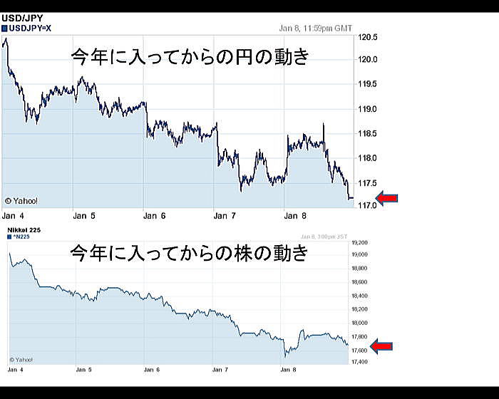 今年に入ってからの円と日経平均株価をグラフ化してみました! ,, グラフを見ると、株価の低落と円高が相関していることが分かります。今後、さらに株価が低下すると、円高がどんどん進むことになります。とはいえ、民主党時代1ドルが最高80円近くまで行ったころと比べると、まだまだ超円安と言えます。 ![]() 出典:日経平均株価及び円/ドル情報より青山貞一が作成 なお、この株安の傾向は全世界的なものです。 全世界の最富裕層上位400人が、わずかこの1週間で24兆円もの資産を失ったという報告もあります。 以下はその記事です。 ◆世界最富裕層、一年の最初の一週間で1940億ドルを失う 出典:スプートニク 米国、ダウ平均株価は119年来の暴落c AP PHOTO/ RICHARD DREW 世界の最富裕層上位400人は、今年最初の取引週間で、中国経済の減速と石油価格下落のため、1940億ドルを失った。ブルームバーグ・ビリオネアーズ・インデックスが報じた。米国債券市場においては、2011年以来最悪の一週間となった。 なお、2015年の最初の取引週間5週で、億万長者リスト掲載者の総資産は、290億ドル目減りした。 最も多い59億ドルを失ったのは世界第4位のお金持ちでアマゾンの創始者ジェフ・ベゾス氏。世界第1位のビル・ゲイツ氏は45億ドルを失い、氏に続くアマンシオ・オルテガ氏は34億ドルを失った。 この1週間で、47人の億万長者が、10億ドル以上の損失を出した。 ブルームバーグが作成する億万長者リスト掲載者の総資産額は3.7兆ドル(ドイツのGDPに匹敵する)で、昨年のそれは4兆ドルだった。 |