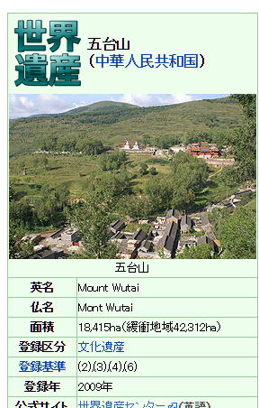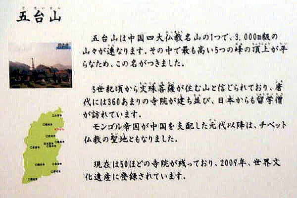 ◆五台山 ![]() 世界遺産 ![]() ![]() 出典:牛後語Wikipedia ![]() 「神怡舘」内部展示より 撮影:青山貞一 Nikon Coolpix S9900 2016-12-22 下は五台山の位置を示しています。 ![]() 出典:グーグルマップ 行き方としては、大同駅からバスで南に212km行ったところにあります。時間で3時間16分とありますが、実際にはバスが郊外で80km/h以上の速度をだすのでこれより30〜40分短いようです。 ![]() 出典:グーグルマップ 五台山(ごだいさん)は、中国山西省東北部の五台県にある古くからの霊山です。標高は3,058mもあります。仏教では、文殊菩薩の聖地として、古くから信仰を集めています。旧字表記では、五臺山。別名は、清涼山。2009年にユネスコの世界遺産(文化遺産)に登録されました。 五台山の山名の由来は、この山が五つの主要な峰によって構成されていることによっています。 東台 望海峰 西台 挂月峰 南台 錦綉峰 北台 葉頭峰(最高峰。海抜3058m) 中台 翠岩峰 五台山内には、北魏の時期に大浮図寺と呼ばれる寺が建立され、それ以後、多数の山岳寺院が建立されました。その最も繁栄した時期には、300以上の寺が林立していたといわれています。 観音菩薩の霊場である普陀山と、普賢菩薩の霊場である峨眉山、地蔵菩薩の霊場である九華山と並んで、中国仏教の聖地とされています(中国三大霊山、中国四大仏教名山)。 現在でも、台内に39ヶ寺(南山寺、顕通寺、塔院寺、碧山寺、普化寺、観音洞、龍泉寺、金閣寺など)、台外に8ヶ寺(延慶寺、南禅寺、秘密寺、尊勝寺など)で、合計47ヵ寺の寺院が存在します。 日本の平安時代から鎌倉時代の入唐僧や入宋僧の多くも、天台山と共に率先してこの山を訪れました。また、チベット仏教の教徒の尊崇も集めており、菩薩頂と呼ばれる寺院のある五台山は、中国内地では、漢伝仏教とチベット仏教との唯一の共通の聖地となっています。 以下は五台山の写真集です。 ![]() 10世紀頃の五台山の寺院群 出典:中国語Wikipedia ![]() 五台山 出典:wikipedia ![]() 五台山 出典:山西博物院 ![]() 「神怡舘」内部展示より 五台山 五台山 撮影:池田こみち Nikon Coolpix S9900 2016-12-22 ![]() 「神怡舘」内部展示より 撮影:青山貞一 Nikon Coolpix S9900 2016-12-22 ![]() 五台山 出典:中国語Wikipddia ![]() 五台山 出典:中国語Wikipddia ![]() 五台山 出典:中国語Wikipddi ![]() 山西省 (トリップアドバイザー提供) ![]() 五台山 出典:Wikipedia ![]() 五台山 出典:Wikipedia ![]() 五台山 出典:山西博物院 ![]() 五台山 出典:山西博物院 ![]() 五台山 出典:中国国家観光局公式Web ![]() 五台山 出典:中国国家観光局公式Web ![]() 五台山 出典:中国国家観光局公式Web ![]() 五台山 黛螺頂(別名・大螺頂、仏頂庵)の本殿 出典:Wikipedia ![]() 五台山全景 撮影:青山貞一 Nikon Coolpix S9900 2016-12-22 ![]() 「神怡舘」における五台山展示 撮影:池田こみち Nikon Coolpix S9900 2016-12-22 ![]() 「神怡舘」内部展示より 撮影:池田こみち Nikon Coolpix S9900 2016-12-22 つづく |