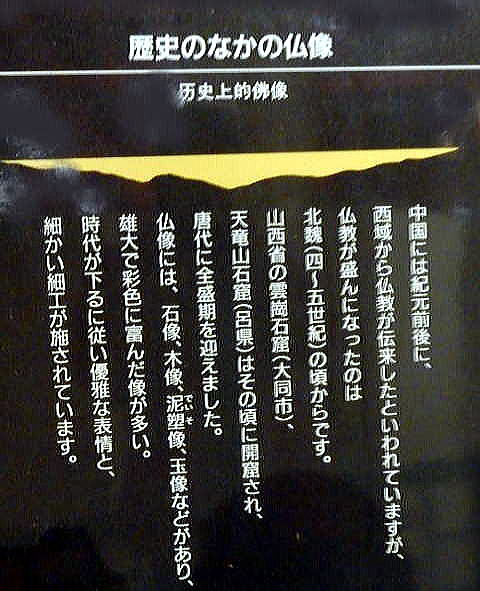 ◆歴史のなかの仏像 ![]() 「神怡舘」内部展示より 撮影:青山貞一 Nikon Coolpix S9900 2016-12-22 中国には紀元前後に、西域から仏教が伝来したと言われていますが、仏教が盛んになったのは、北塊(4〜5世紀)の頃からです。 山西省の敦厚雲崗石窟(大同市)、天龍山石窟(呂県)はそのころに開窟され、唐代に全盛期を迎えました。 仏像には、石像、木造、泥塑像、玉像などがあり、雄大で彩色にとんだ像が多いのです。 時代が下がるに従い優雅な表情と細かい細工が施されています。 ◆日中友好記念「神怡舘」内部 ![]() 日中友好記念「神怡舘」 撮影:池田こみち Nikon Coolpix S9900 2016-12-22 ![]() 日中友好記念「神怡舘」 撮影:池田こみち Nikon Coolpix S9900 2016-12-22 ![]() 日中友好記念「神怡舘」 撮影:青山貞一 Nikon Coolpix S9900 2016-12-22 ![]() 日中友好記念「神怡舘」 撮影:池田こみち Nikon Coolpix S9900 2016-12-22 <雲崗石窟の仏像> ![]() 「神怡舘」内部展示より 撮影:青山貞一 Nikon Coolpix S9900 2016-12-22 ![]() 出典:wikipedia ![]() 出典:山西博物院 <天龍山石窟の仏像> ![]() 座っている仏像の胴体 出典:English Wikipedia ![]() 坐菩薩 出典:English Wikipedia ![]() 站立菩薩 出典:English Wikipedia <南禅寺大仏殿> ![]() 大殿内には、唐代塑像中の傑作と言われる17尊の木造塑像があります。 出典:壮大な歴史との出会い 山西省 埼玉県山西省友好記念館 つづく |