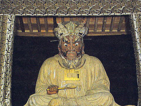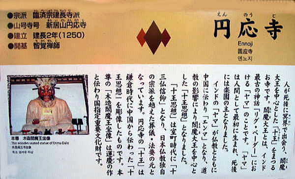 私達は下の地図にある建長寺を後に鶴岡八幡宮の方向に歩きました。するとすぐ右に建長寺の塔頭(たっちゅう、後述)で唯一公開されている円応寺がありました。 ![]() 出典:グーグルマップ 下の写真は円応寺の山門に通ずる階段です。 写真は右側が建長寺、左側が鶴岡八幡宮側になります。 ![]() 撮影:青山貞一 Nikon Coolpix S8 2015-11-27 ◆建長寺の塔頭 塔頭(たっちゅう)は、祖師や高僧の墓塔を守るために、師の徳を慕う弟子らが建立した小寺院を意味しますが、転じて大寺院の境内周辺に建てられた小寺院を指します。 建長寺には最盛期には49院もの塔頭がありましたが、現在は境外塔頭を含め12院を残すのみです。 塔頭のうち常時公開されているのは、境外塔頭の円応寺(新居閻魔堂)のみです。 長寿寺は春秋などに時期を限って公開、妙高院、龍峰院は観音霊場巡りの巡礼者のみ入れていますが、他の塔頭は原則非公開となっています。 ![]() 撮影:青山貞一 Nikon Coolpix S8 2015-11-27 ◆円応寺 下は拝観受付で拝観料を払う池田です。拝観料は大人一人200円です。 ![]() 撮影:青山貞一 Nikon Coolpix S9900 2015-11-27 円応寺(えんのうじ)は、神奈川県鎌倉市山ノ内にある建長寺と同じ臨済宗建長寺派の仏教寺院です。開山は桑田道海(智覚禅師)とも伝えられますが未詳です。 山号は新居山といい鎌倉時代作の閻魔像や冥界の十王の像で知られます。 別名「新居閻魔堂」、「十王堂」とも呼ばれています。 ![]() 撮影:青山貞一 Nikon Coolpix S8 2015-11-27 ◆円応寺の概要 円応寺(えんのうじ)は別名新居閻魔堂です。 もとは由比郷、続いて材木座に移転し、近世に現在地に移転しました。本堂には閻魔王を含む冥界の十王像を安置しています。桑田道海(智覚禅師)の開創といいますが定かでありません。 ・所在地: 神奈川県鎌倉市山ノ内1543 ・山号:新居山 ・宗派:臨済宗建長寺派 ・本尊:閻魔王 ・創建年:(伝)建長2年(1250年) ・開基:(伝)桑田道海(智覚禅師) ・別称:新居閻魔堂、十王堂 ・札所等:鎌倉地蔵尊霊場第八番、鎌倉十三仏5番(地蔵菩薩) 文化財 ・木造閻魔王坐像 ・木造初江王坐像 ・木造倶生神坐像2躯 ・附:木造鬼卒立像、木造檀拏幢 ◆円応寺の歴史 『新編鎌倉志』等によれば、円応寺は建長2年(1250年)の創建で、開山は建長寺開山蘭渓道隆の弟子にあたる桑田道海(智覚禅師)とされています。 しかし、桑田道海は1309年没で、年代が合わないこと、1250年といえば師の蘭渓道隆が開山した建長寺の落慶より以前であることなどから、当初から禅寺として建てられたことには疑問が持たれています。 円応寺は当初は由比郷見越岩(鎌倉大仏の東側)に建てられたようですが、ほどなく滑川の川岸へと移転しました。鎌倉市材木座5丁目11番地に新居閻魔堂跡を示す石碑が残っています。 現在の川岸から200-300メートルほど東側に離れていますが、閻魔堂創建当時、このあたりが川岸だったと想定されます。 なお滑川下流部は別名閻魔川とも呼ばれていますが、これはこの閻魔堂に由来しています。 本尊の閻魔像から新居閻魔堂と呼ばれ信仰を集めましたが、元禄16年11月23日 (旧暦)(1703年12月31日)の元禄大地震による津波被害により建物が大破しました。その翌年、山ノ内の現在地に移転しました。寺は建長寺から鎌倉街道を挟んで向かい側の小高い敷地に位置していますが、この地はもと建長寺塔頭の大統庵のあったところです。 ところで、円応寺では、残念ながら本堂内はすべて撮影禁止となっていました。以下の写真は参拝時に頂いたパンフレットにある写真です。 ◆円応寺の伽藍 本堂 本堂は本尊の閻魔像や十王像等の像を安置しています。 ![]() 撮影:青山貞一 Nikon Coolpix S8 2015-11-27 鐘楼 ![]() 円応寺の鐘楼 撮影:青山貞一 Nikon Coolpix S8 2015-11-27 ◆文化財(重要文化財) ・木造閻魔王坐像 ・木造初江王坐像 ・木造倶生神坐像2躯 ・附:木造鬼卒立像、木造檀拏幢 ![]() 本堂内部 出典:参拝時に頂いたパンフレット ![]() 木造閻魔王坐像 出典:参拝時に頂いたパンフレット 以上4躯(附指定2点)が一括して重要文化財に指定されています。 木造閻魔王坐像像は高さが190.5cmある閻魔像です。 『新編鎌倉志』によると寛文13年(1673年)に像の補修を行った際、胎内から文書が発見され、建長2年(1250年)の作で、永正17年(1520年)に修理が行われた旨の記述があったといわれています。 現存する像は頭部のみが鎌倉時代の作で、体部は江戸時代のものに替わっています。 運慶作との伝えもありますが、1250年には運慶は没しており、伝承にすぎないようです。 関東大震災後にも像の補修が行われています。像の表情が笑っているようにも見えるため「笑い閻魔」とも呼ばれています。また参拝客の子供を食べたという伝承から、別名「人食い閻魔」とも呼ばれています。 「笑い閻魔」・「人食い閻魔」と呼ばれる由縁についてはそれぞれ伝承が残っています。木造初江王坐像十王像のうちのひとつで、写実的な表情、複雑な衣文表現には運慶派の特徴とともに宋風彫刻の影響が感じられる造形の像です
