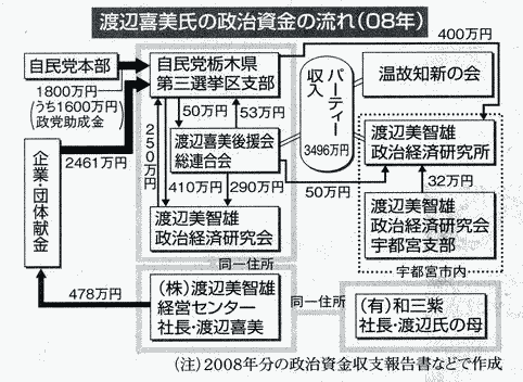 参院選を前に新党づくり、「第三極」を標ぼうする動きが強まっていますが、いずれも古い自民党政治の枠から抜け出せていません。「みんなの党」代表の渡辺喜美元行革担当相(衆院栃木3区)の「政治とカネ」をみてみると、自民党政治家そのものの実態が浮き上がります。(「政治とカネ」取材班)
