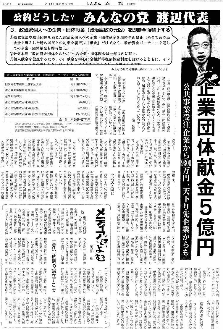 ■2010/06/03 (木) みんなの党・渡辺代表に企業献金5億円