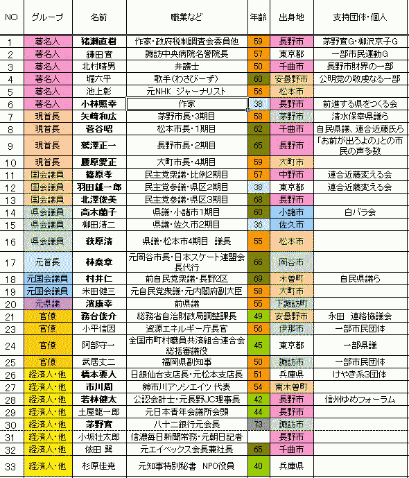 この夏に迫った信州・長野県の知事選挙。 地元では連日、連夜県内各所で候補者選定の皮算用が行われている。 県民そっちのけ、名指しされた当人もそっちのけ、まさに蜂の巣をつっついたような喧しい騒乱?状態となっている。 繰り返すが、これら一連の動きに共通しているのは、候補者とされる人物が何を考え、何を理念、哲学とし、何を政策、施策としていうるかがおかまいなしであることだ。 ところで、肝心な候補者案だが、ここ一週間でさらに混沌としてきた。 先に知事候補案として、15団体が5人をノミネートしていることを伝えた。 それとは別に、ジャーナリストの池上彰氏、前回出馬の市川周氏、茅野市長の矢崎和広氏、評論家の猪瀬直樹氏、参議院議員の羽田雄一郎氏の名前があがっている。 さらに長野市長の鷲沢正一氏、大町市長の腰原愛正氏、弁護士の北村晴男氏、元八十二銀行頭取の茅野實氏の名前も挙がっていると伝えた。 周知のように、地元では前回知事選の苦い経験?からか、候補者の「一本化」が最重要課題となっている。だが、どうみても一本化なんてどこ吹く風、日替わりメニュー状態が続いている。 ある県内事情通によれば、その後も知事候補は続々とノミネートされており、下の表にあるように、5月14日現在、何と33人もの名前があがっていることが分かった! もちろん、ノミネートとは言っても、巷の声に類するものもある。 その中には本連絡の第一回目で報じた菅谷昭松本市長のように、明確に固辞されたひともいれば、結構その気になっているひともいる。 なお、以下の表で太字となっている候補者案は、新聞、テレビ等のメディアで比較的露出が多いひとを表している。 また同グループ(署名人...など)では、ノミネートされた時期が早いひとを上段に掲載している。また支持団体・個人でGとあるのは、グループの略称である。 それにしても、この場に及んでなお、すさまじい人数である。 これをどうやって一本化するのか、見物である。 ![]() 2006年5月14日現在。 出典:県内事情通からの情報 以下は、上の表で名があがっているひとたちの簡単なプロフィールあるいは若干のコメントである。これについては今後、順次、拡充する予定。 まず猪瀬氏だが5月のGW連休中、長野高校OBらと長野で会合を持ってた。条件が整えば、それなりに意欲があるようだ。 北村弁護士。『行列のできる〜』で一躍有名になった。ご本人は絶対出ませんと一言とか。 歌手の堀六平氏は2004年の参議院議員選挙に立候補し落選。 池上彰氏はNHK週刊子供ニュースなどで有名。松本市の出身。 小林照幸氏は、作家で「朱鷺の遺言」で大宅壮一ノンフィクション賞を受賞。出身は長野市。 矢崎和広氏は、現役、茅野市長で現在三期目。当人は出馬を否定している。 菅谷昭氏は、現役、松本市長、本コラム第一回目に書いたように、出馬はきっぱりと否定している。 鷲澤正一氏は、現役の長野市長。メーデーで菅谷市長待望論をぶったことで、菅谷市長が会見で全面否定へ。 腰原愛正氏は、現役の大町市長。四期目。今期で市長を引退する旨を表明している。 篠原孝氏は、現役の民主党衆議院議員。比例二期目。当人は「絶対でないとコメント」している。 羽田雄一郎氏は、現役の民主党参議院議員。二期目。羽田孜衆議院議員の長男。 北澤俊美氏は、現役の民主党議員、三期目。長野市出身。意欲あり? 高木蘭子氏は、現役の県議会議員(県民クラブ・公明)、一期目。小諸市出身。白バラ会が支持団体。ただし、本人は立候補を否定している。 柳田清二氏は、現役の県議会議員(県民クラブ・公明)、二期目。小諸市出身。元井出昌一衆議院議員秘書。 萩原清氏は、現役の県議会議員で議長。四期目。松本市出身。争点や対立軸を明確にするために議長が出たらと言う声が県民から挙がっている。 林泰章氏は、元岡谷市長で日本スケート連盟会長代行。松本市出身。 村井仁氏は、元自民党衆議院議員、長野二区。木曽町出身。務台氏でまとまらない場合一部から待望論がでている。 米田健三氏、元自民党国会議員。大町出身。 務台俊介氏。現役の総務省自治財政局調整課長。安曇野市出身。永田恒治弁護士らが支持団体。当人はやる気満々? 小平信因氏は、資源エネルギー庁長官。伊那市出身。一部の市民団体が支持。 阿部守一氏は、元長野県副知事。全国市町村職員共済組合連合会総括審議役。一部の県議が支持している。 武居丈二氏は、福岡県副知事で諏訪市出身。一部市民団体が支持。 橋本要人氏は、日銀仙台支店長。元松本支店長。兵庫県出身。けやき系3団体が支持。以前から名前が挙がっている。 市川周氏は、市川アソシエイツ代表。南木曽町出身。意欲はある。前回落選した。今回は担ぐ人は今のところなし。 若林健太氏、若林正俊参議院議員長男。公認会計士、元長野JC理事長。長野市出身。信州ゆめフォーラムが支持。当人は出馬意欲満々。 土屋龍一郎氏、元日本青年会議所(JC)理事長。長野