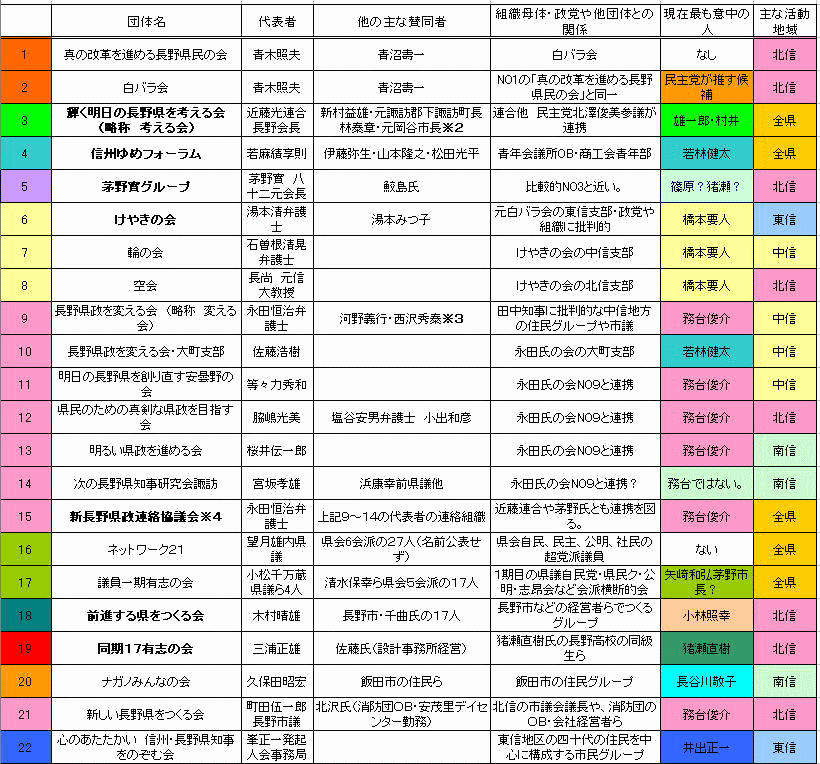 その後も、信州・長野県の知事選挙への立候補者の擁立を目指す動きは、活発化している。 地元メディアは、会合や関係者への個別取材から個々の動きを把握し、記事にしているものの全体像はほとんど把握しておらず、日々、混迷は深まるばかりである。 それを指して長野県民の自由闊達な活動、真の民主主義のあらわれなどと、表しているひともいるが、果たしてそうだろうか? 信州痴痔戦・猿山狂騒戯画〜混迷を極める知事候補選定〜、<その6>では、その後の立候補者擁立の動きを追ってみた。 とは云っても、日替わりで変わる状況にどこまで追いついているか、いけるか分からないのが実態だ。 下の表は、5月27日までの状況を、新人の擁立を目指す団体やグループと言う観点で一表にまとめたものである。 |