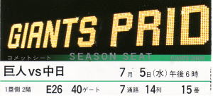知人が東京ドームの年間予約券(Season Seat)、それもネット裏で球場全体が手に取るように見渡せるすばらしい席を持っている。 そんなこともあって、後楽園球場の時代から、毎年どんなに忙しくても巨人vs.中日の試合に限って東京ドームに観戦に行っている。 私は疎開中愛知県で生まれた。 そんなこともあり、幼少のころから中日ファンである。ある年は、後楽園、神宮、横浜球場と関東での試合をすべて見たこともある。 仕事で名古屋に行ったときなど、ドーム以前のナゴヤ球場にも足を運んだこともあった。 昨日(2005.7.5)は、ひさびさ巨人vs.中日を観戦した。 以前は4枚つづりでシーズンシートをもらっていたが、無駄にすることが多いので、今では2枚もらっている。 7月5日は同僚の池田こみちさんと一緒に地下鉄南北線で雨の中、後楽園に向かった。6時ちょっとすぎに到着した。9.11以降、入り口でものものしい持ち物検査がある。 席に着くとすでに1回裏になっていた。 ![]() 今年は中日がつい最近まで10連勝するなど、調子がよくセリーグ首位だ。 一方、巨人は10連敗の後、2連勝し中日戦となり、一昨日は中日に負けている。現在、セリーグ4位である。 とは言え、巨大都市東京をホームグランドとする讀賣巨人軍、東京ドームはいついっても超満員。だが満員のように見えたがよく見ると、かなり空席が目立つ。 テレビ放映の視聴率もかなり下がっていると聞いているが、やはりここまで巨人が弱くなると、ファンも減るのだろうか。 ところで、試合は今まで見た中でも、これ以上ないくらいすばらしい投手戦となった。 中日は6月の月刊MVPをとったばかりの若手、佐藤充投手だ。 今や投手王国となっている中日にあって、佐藤は6月は4試合に登板、すべて完投。リーグ最多タイの4勝を挙げている。防御率も1点台である。 一方、巨人はパウエルが投手だ。パウエルは勝ち星にこそ恵まれていないが巨人の当初の中では先発組にあって球威、球速ともあり、すばらしい当初である。 試合は佐藤とパウエルの手に汗握る投手戦となった。 佐藤の好投はまdしも、パウエルも140km/hを超す速球と下に落ちるカーブを駆使し、中日の打者のつけいる隙を与えず最近にない出来ばえである。 その結果、6回まで息がつまるような投手戦となった。 しかも、エラーは両軍皆無。まさに絵に描いたような投手戦だ。