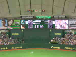 敵ながらパウエルの力投は立派。首位中日の打者も外野までなかなか打球がとばないありさまだった。 ところで問題の事件は6回裏に起きた。巨人は一死一、二塁から小坂の中飛でタッチアップした二塁走者パウエルが三塁に達した。 センターの外野手は、離塁が早いとしてアピールしたが、審判の判定はセーフとした。これに猛烈に抗議した落合監督は最終的に投手、野手全員をベンチに引き上げさせる。 約15分の中断の最中、何と一度も主審はじめ審判から観客への説明がない。 その後やっと落合監督が審判に抗議しているため試合を中断している旨の説明があった。そして数分後、選手を引き上げさせたことがセリーグ野球規則に違反するとして、落合監督を退場させると主審が説明したのである。 現場、それも以下の写真のようにネット裏で球場の全体がよく見渡せるところでしっかり見ていた私たちからすると、投手のパウエルは小坂の中飛で外野手が中飛の球を確保する前に、すでに二塁を離れていた。センターが球を捕獲したとき、一気に三塁に向けて走っていたのである。 周知のように、タッチアップは野手が球を捕るまでは塁を一歩も離れてはならないこととなっている。 これは世界共通の規則である。 もともと足が遅い投手のパウエルが、浅いセンターフライで三塁に行けたこと自体がおかしかったのだが、私も池田さんもパウエルはタッチアップどころか、捕獲まえに二塁から離れており、捕獲後、その場所から三塁に間違いなく走って行ったとそれぞれの自分の目で見て確信していた。 席からはこんな風に見える 両軍ゼロが並ぶスコアーボード落合監督は森野の抗議だけでなく、おそらく自分が見てもそう見えたから抗議したのだと思う。 場所は東京ドーム、圧倒的に多い巨人ファンが落合監督の抗議に大ブーイングとなった。 しかし、事実は事実。間違いなく、タッチアップ前にパウエルは塁を離れていたのである。 しかし、一端下された判定は覆られず、選手全員を引き上げさせたことで落合監督は退場となった。 再開後、佐藤投手は次のバッター二岡をフォークボールで討ち取り、6回を零点に抑えた。 監督退場後、試合は、以下のスコアボードにあるように、7回、巨人が一点を入れ、超好投のパウエルで巨人に押し切られるかと観念したが、ここで、こともあろうか原監督はパウエルを交代させてしまったのである。 8回、中日は谷繁がノーアウトで塁に出て反撃と思いきや代打がダブルプレーとなり、一気にツーアウトの絶体絶命となった。 だが、パウエルをリリーフした巨人の中継ぎ陣はひどくコントロールが悪い。 四球などでツーアウト満塁。それまで三審ばかりだった中日の四番、ウッズがツーストライクからヒットで2者を迎い入れ、終わってみれば2:1で中日の勝ちとなった。 巨人の最大の敗因は原監督の党首交代のミス。 中日の打者にとってまったく歯がたたなかったパウエルをこともあろうか、要所で交替させその後出てきた巨人の投手が四球やヒットなどで中日に逆転を許してしまったのである。